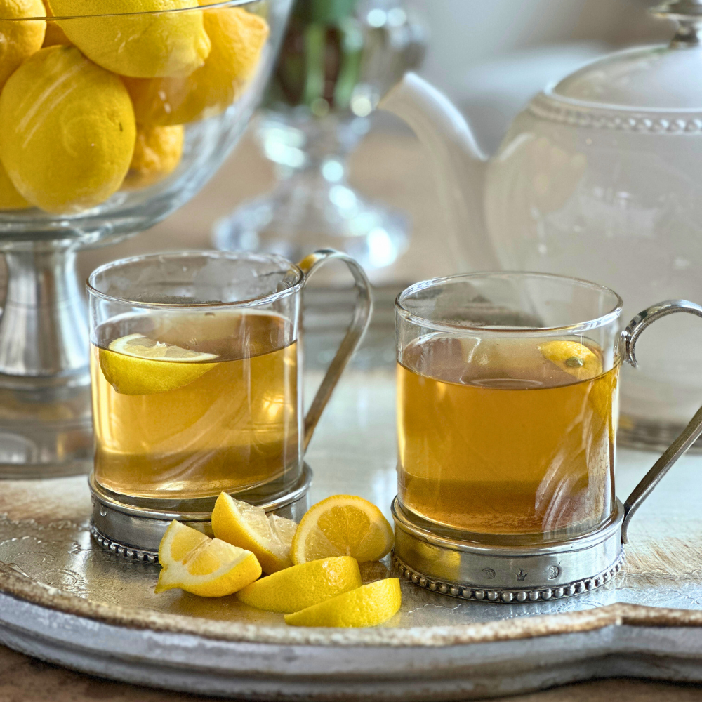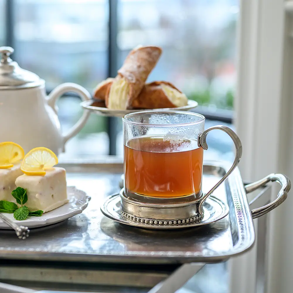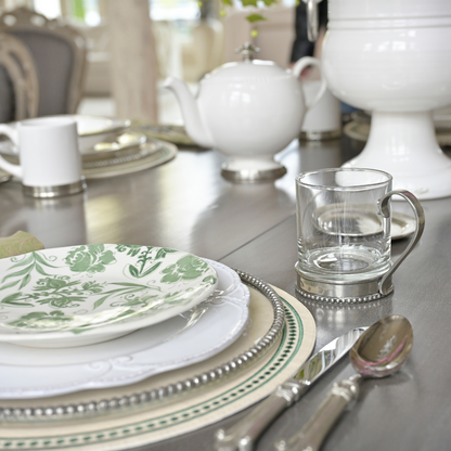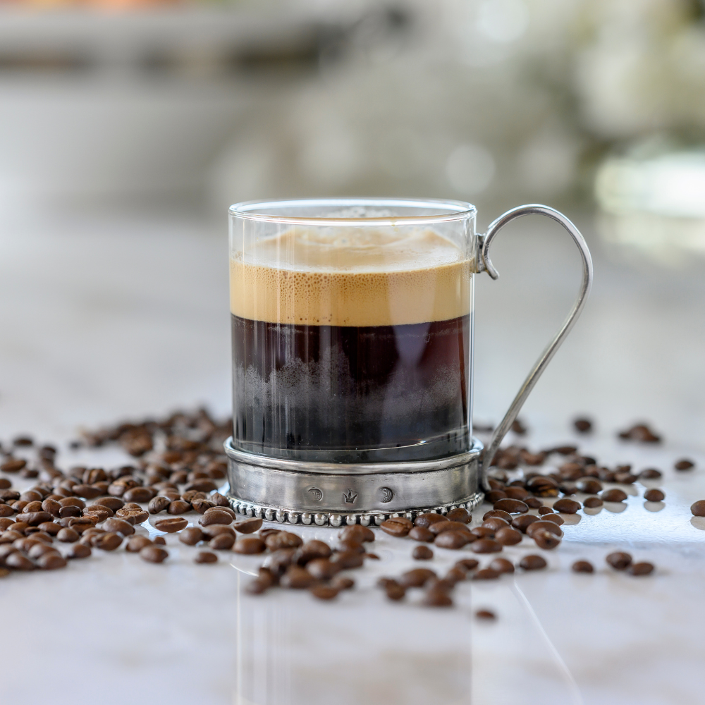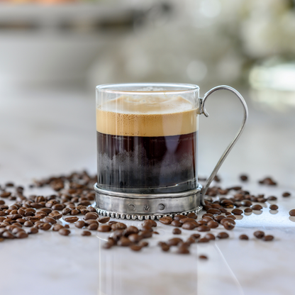 Glass and pewter pair beautifully once again in this new Tesoro Glass Mug. Elevate your morning routine. The delicate pewter base provides a striking contrast to the beaded rim, making it a work of art on your table. Savor your coffee or tea in style and sophistication with this elegant addition to your collection.