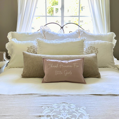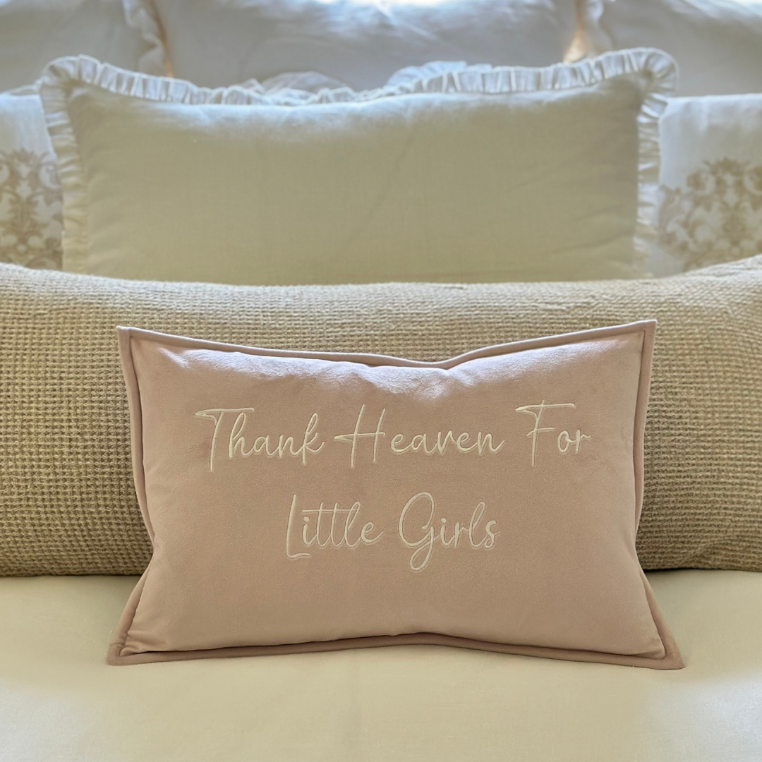 Add a touch of elegance and style to your home with a 100% velvet decor pillow embroidered with the "Thank Heaven for Little Girls" embroidery. Pillow comes 11" x 17", has a zippered opening and a premium synthetic down fill.