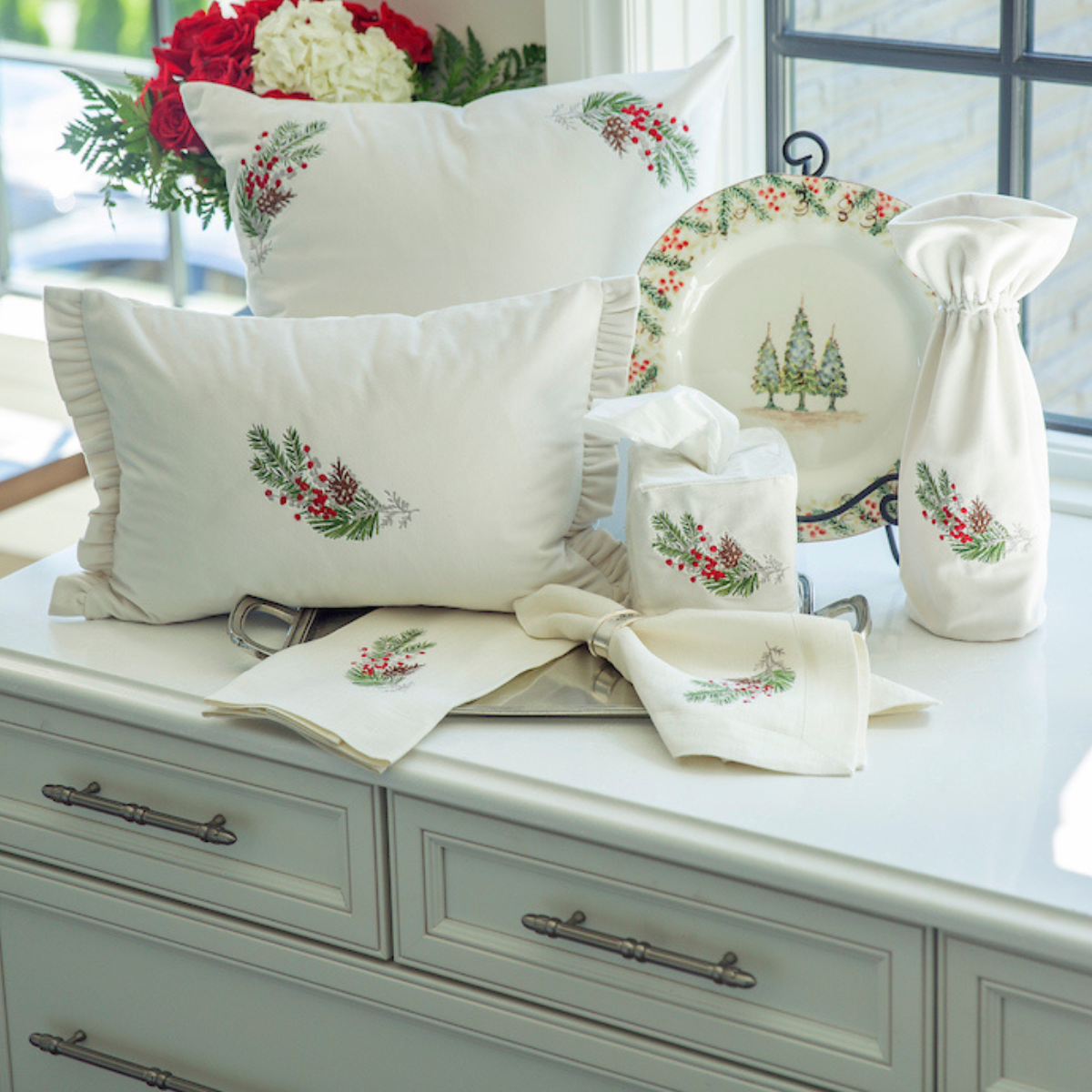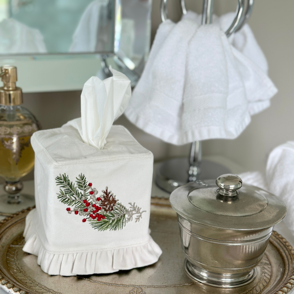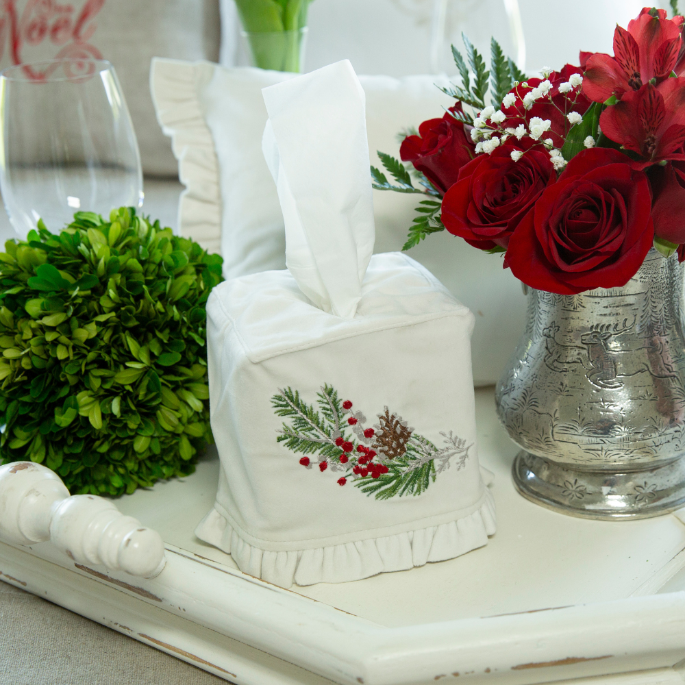 Enjoy this 100% European velvet embroidered tissue box cover with the Natale design inspired by the Arte Italica collection with the same name. It is a perfect way to dress up a guest room or bathroom, complete that elegant seasonal look, and hide the unsightly tissue box.
