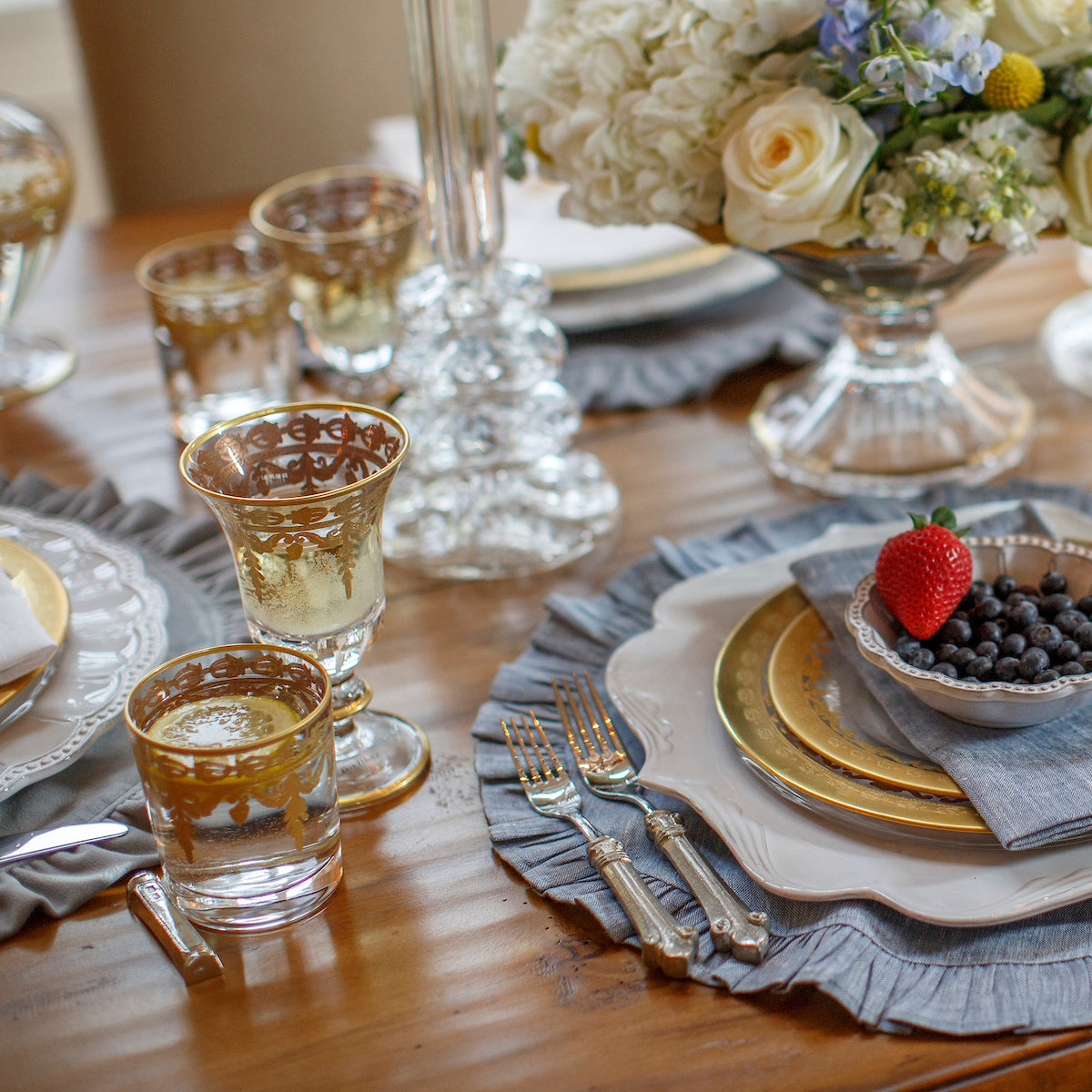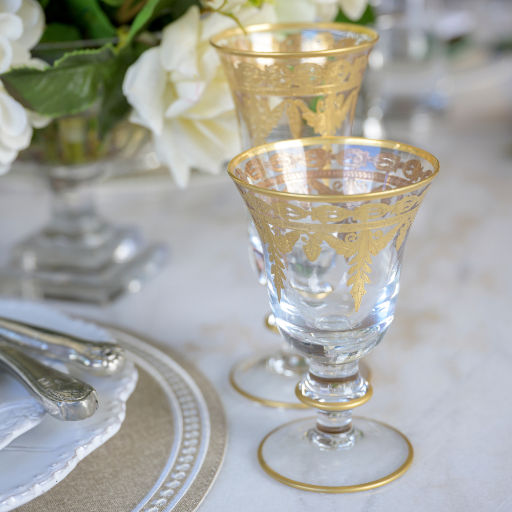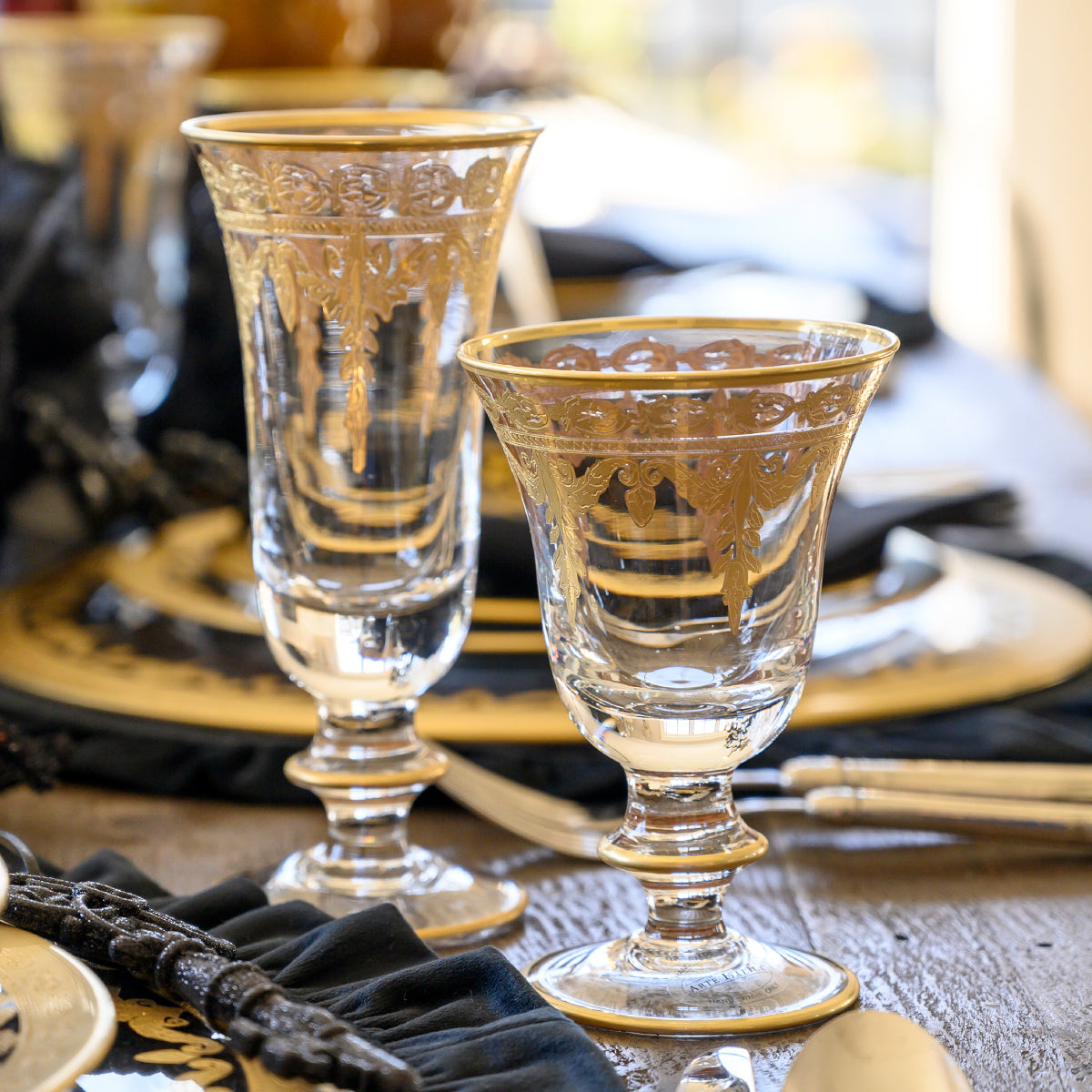 Our Vetro Gold Collection has been known to leave guests speechless. Florentine master artisans hand paint 24-karat gold highlights on intricate hand etched designs. The results are nothing short of extraordinary. One of our most popular collections. Hand made in Tuscany.