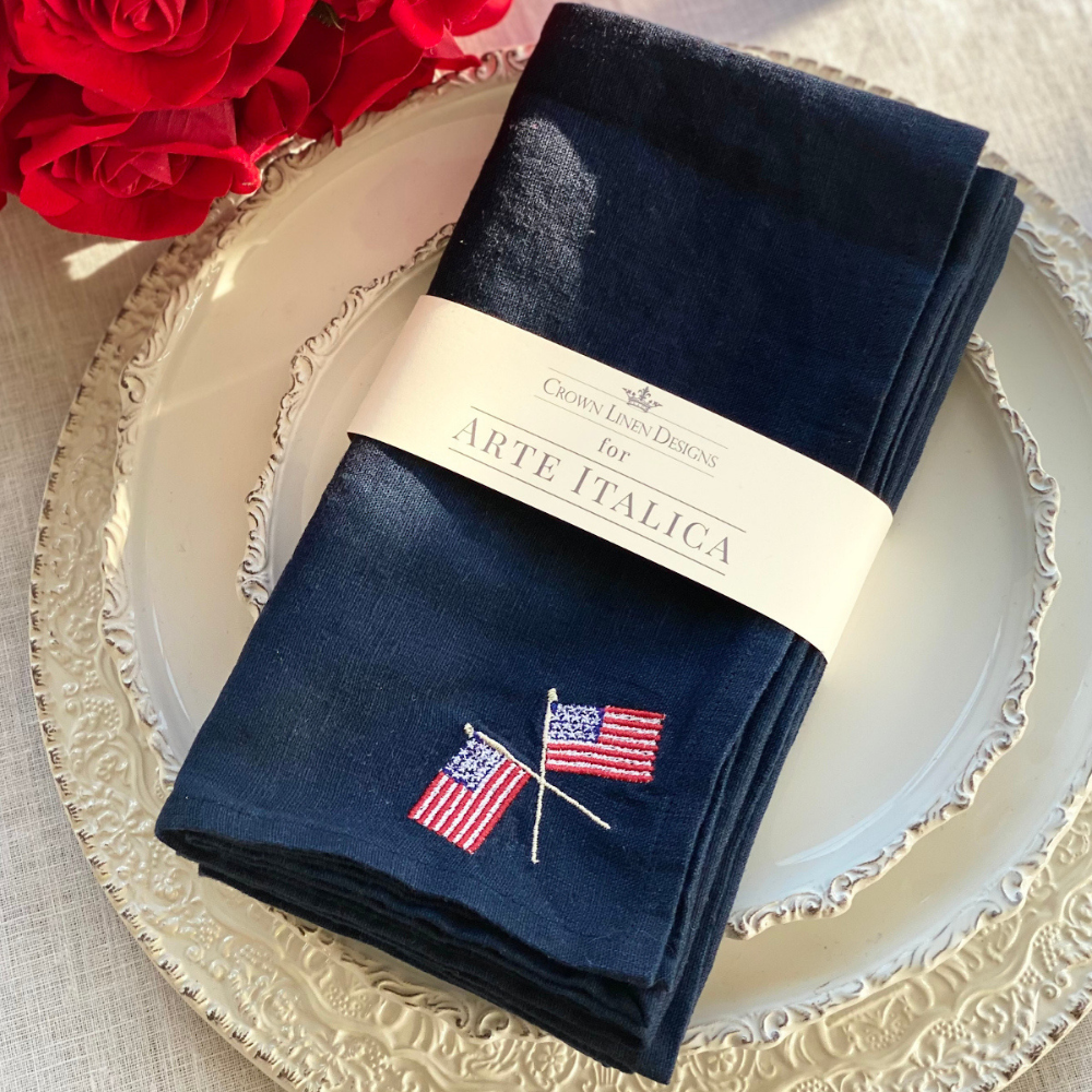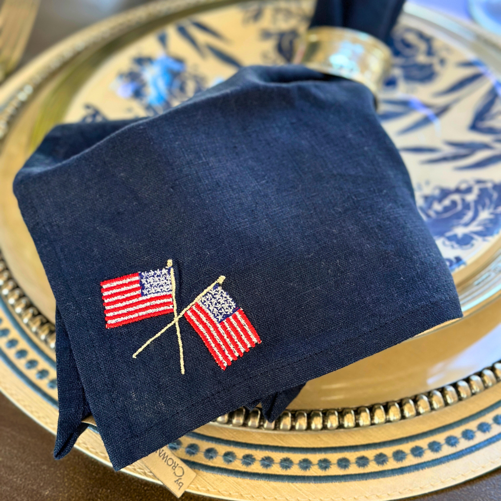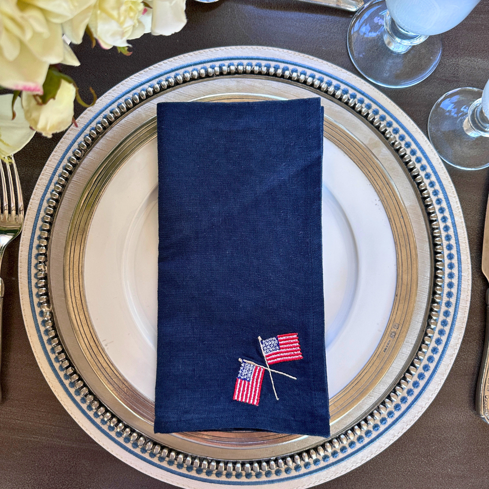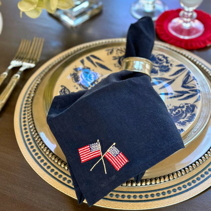 Set of 4 navy linen napkins embroidered with the American flag.