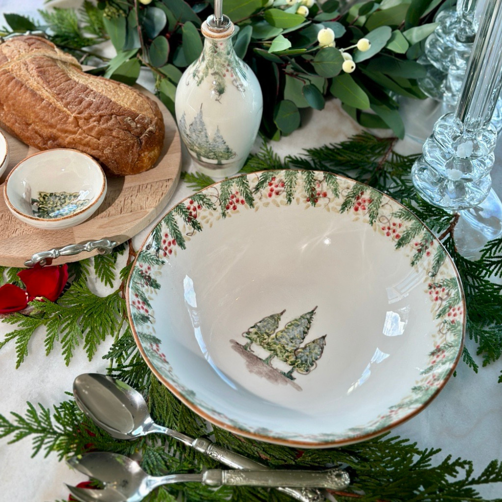 Natale est la collection parfaite pour divertir tout au long de la saison hivernale. Des baies et des branches de pin entourent les conifères enneigés. Fabriqué à la main en Italie.