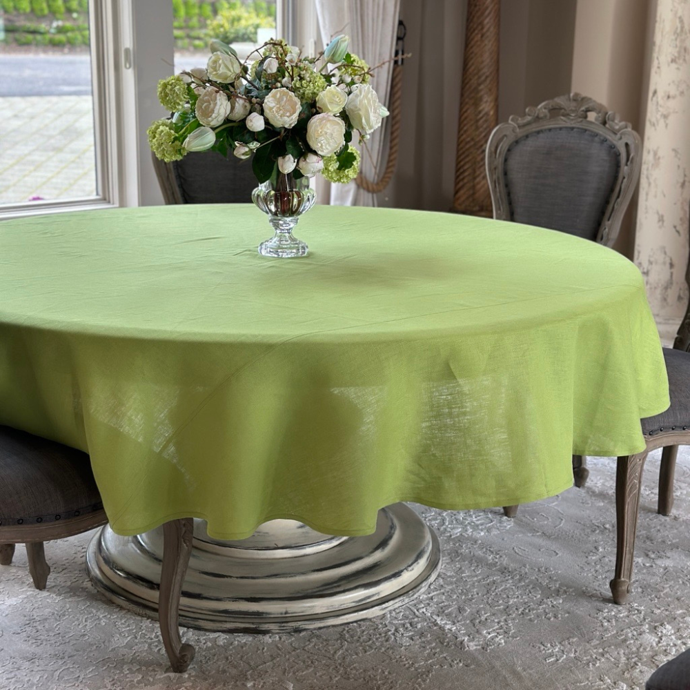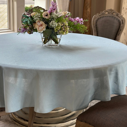 Quelle belle façon d'habiller votre table avec une nappe ronde 100% lin européen. Associez-le à nos serviettes brodées pour une table belle et élégante. Lavage en machine, séchage à plat et repassage facile pour un meilleur look. La nappe est ronde de 90 po, y compris le grand volant.
