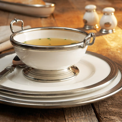 La vaisselle originale en étain et en céramique combine la céramique blanche avec notre garniture en étain signature. Fabriqué à la main avec des matériaux de la plus haute qualité, ce chargeur classique se traduit parfaitement du traditionnel au contemporain, du décontracté au formel. Céramique italienne et étain, Fabriqué à la main en Italie.