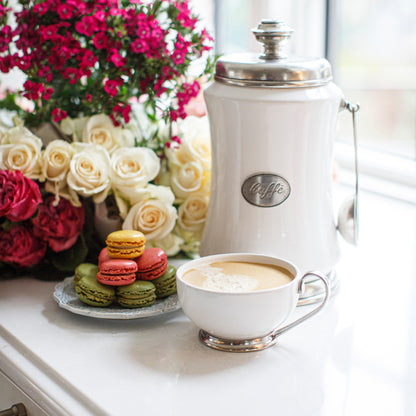 La vaisselle originale en étain et en céramique combine la céramique blanche avec notre garniture en étain signature. Fabriqué à la main avec des matériaux de la plus haute qualité, cet ensemble de tasses classique se traduit parfaitement du traditionnel au contemporain, du décontracté au formel. Céramique italienne et étain, Fabriqué à la main en Italie.