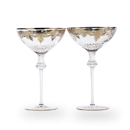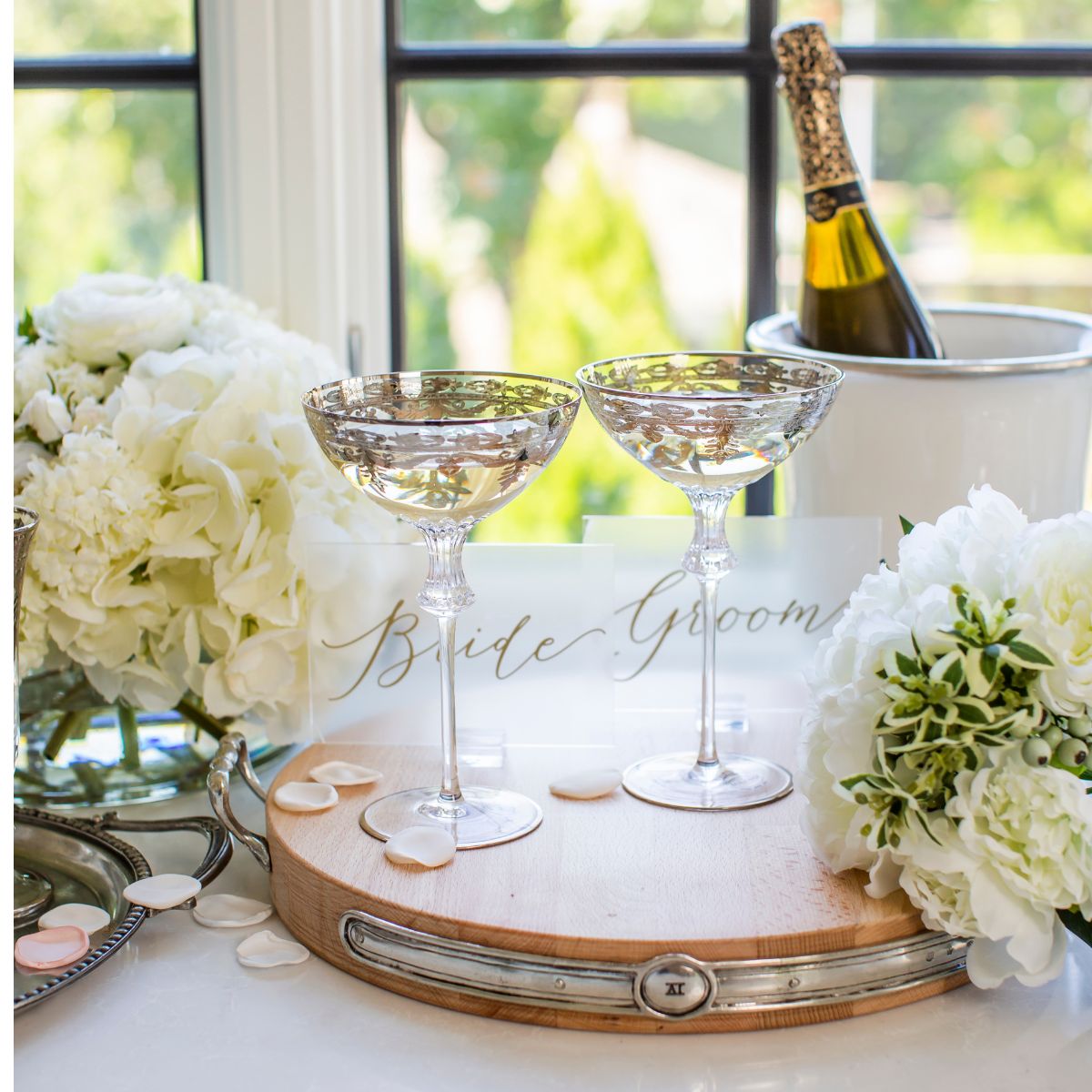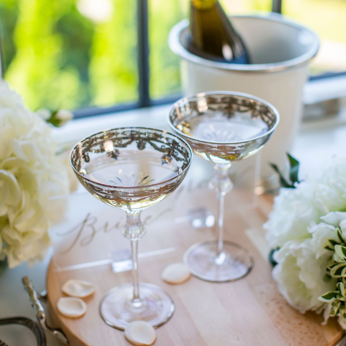 Ce superbe coupé de mariage en platine présente notre motif Vetro Platinum gravé à la main sur un verre coupé classique avec une magnifique longue tige en cristal.