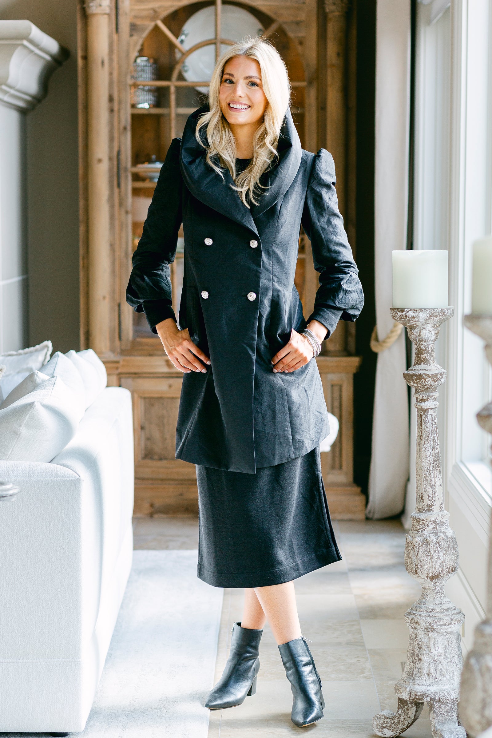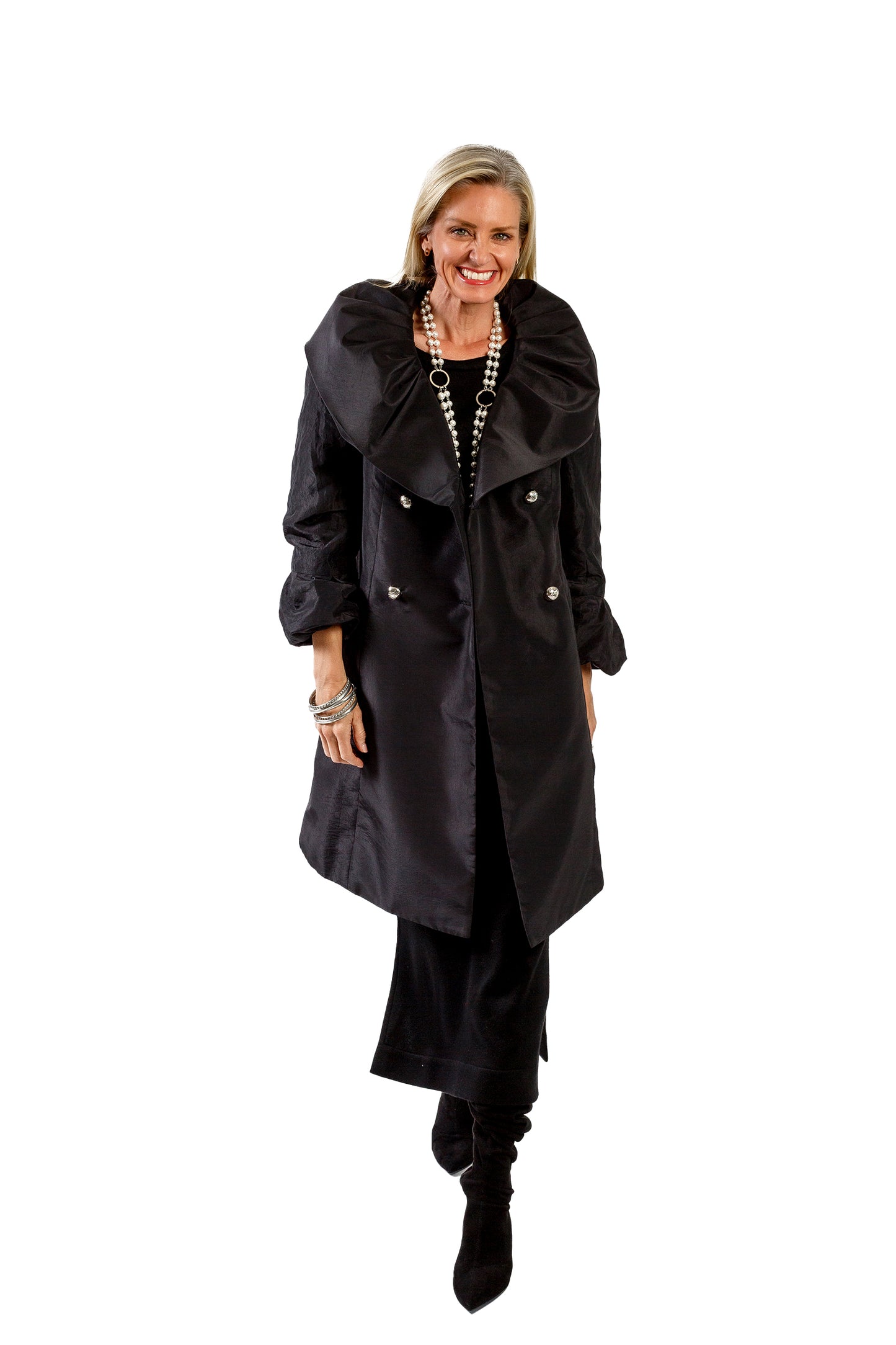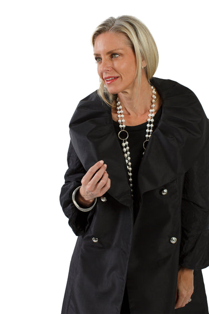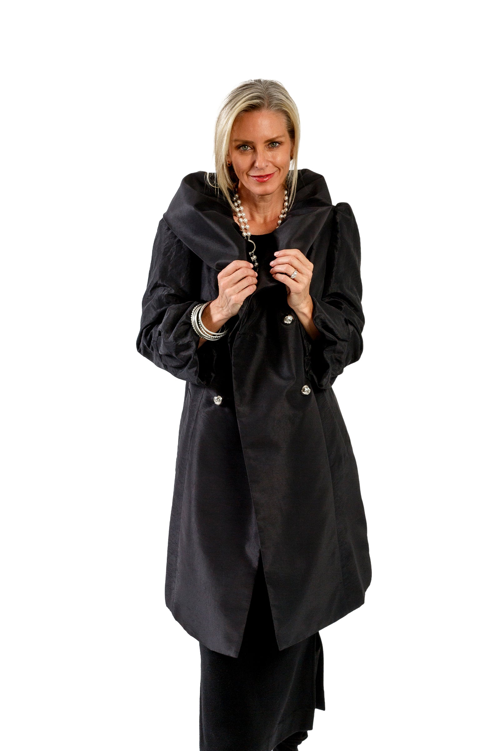 Enveloppez-vous d'une élégance inégalée avec notre manteau en taffetas noir, la quintessence de la sophistication des vacances. Son col châle surdimensionné vous enveloppe d'une chaleur luxueuse, tandis que les quatre boutons métalliques ajoutent une touche de glamour. Embrassez les festivités avec style avec ce manteau exquis qui allie sans effort confort, mode et esprit de la saison.