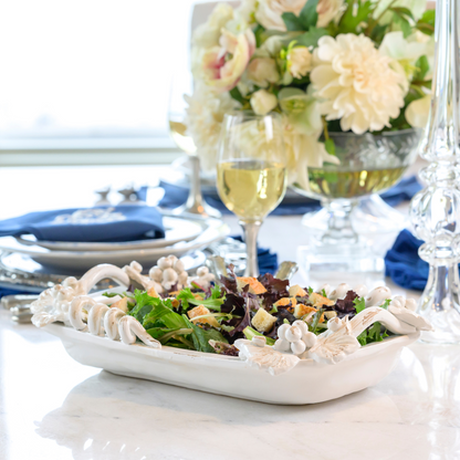 Serve with rustic charm with our Antico Toscana Small Rectangular Dish. Featuring a delicate grape leaf motif that evokes the Italian countryside, the piece works beautifully for serving sides and salads or as a centerpiece. Available in crisp white or warm cream, it brings refined Continental style to both everyday dining and formal entertaining.