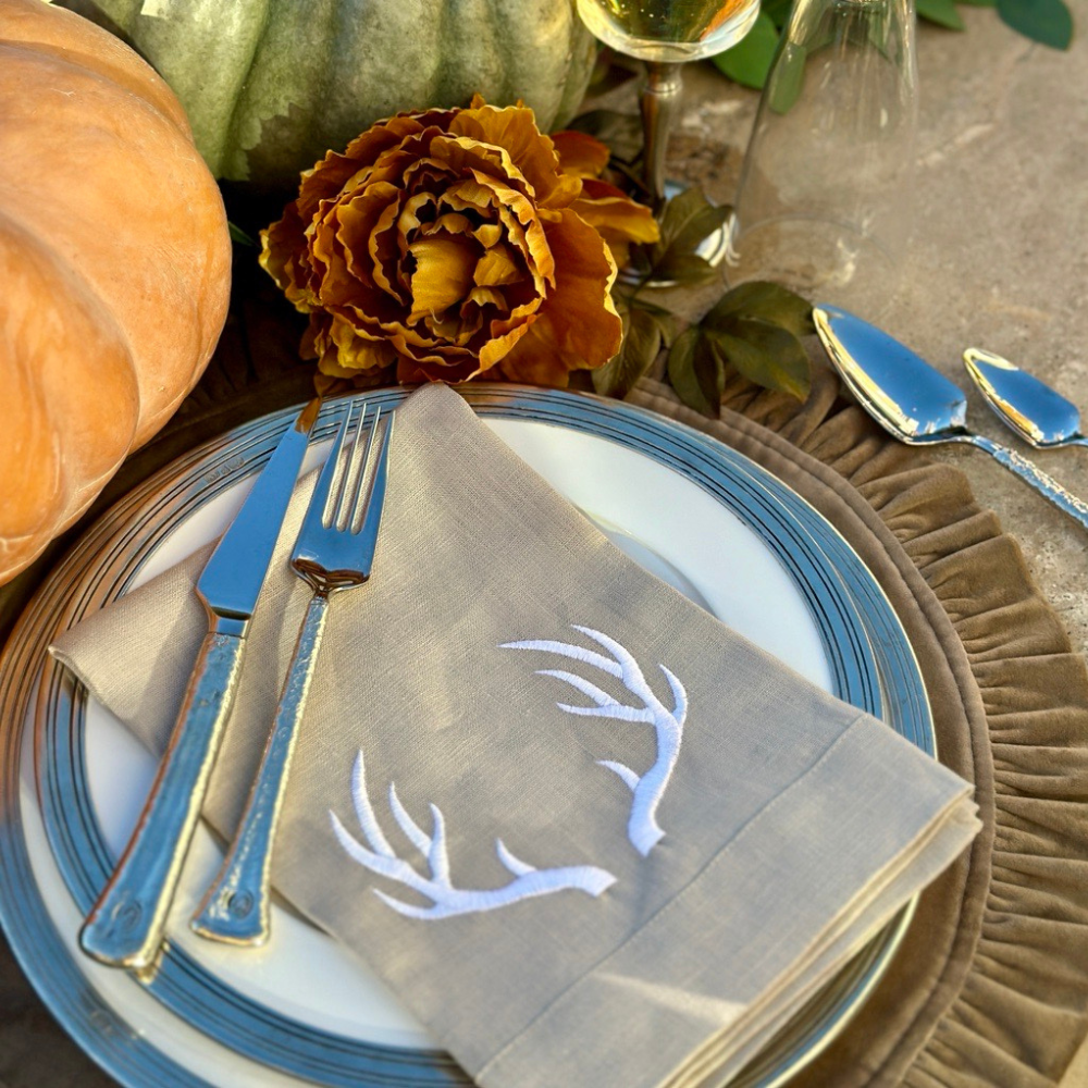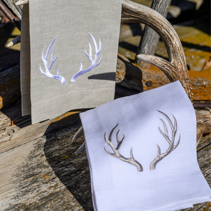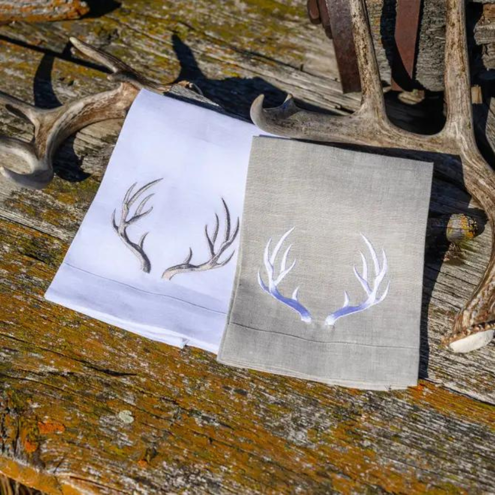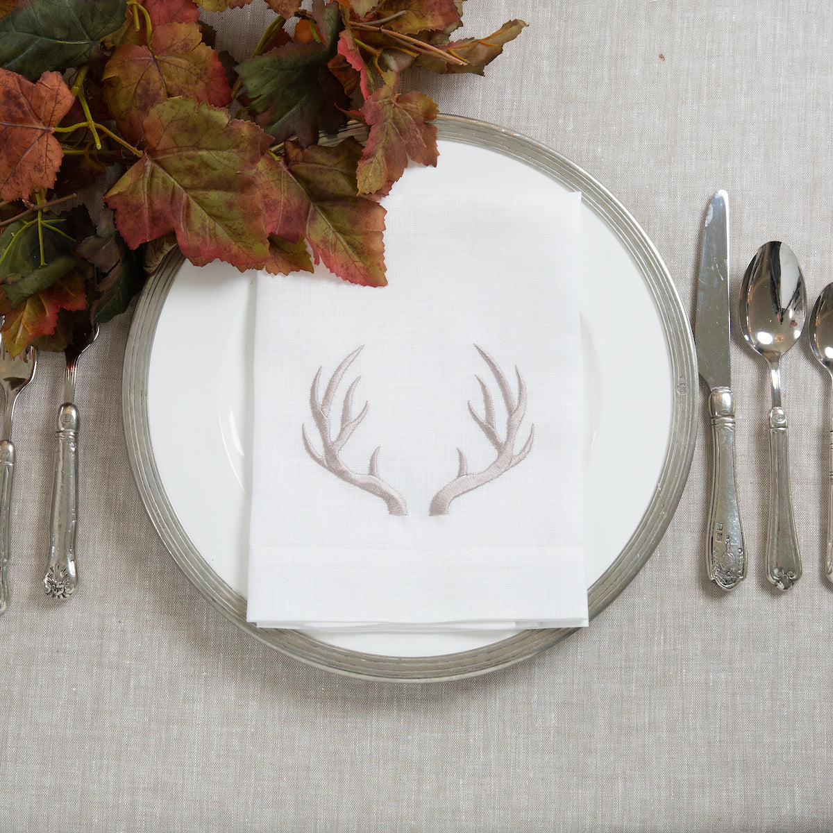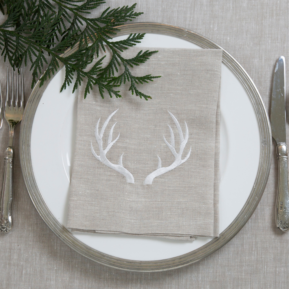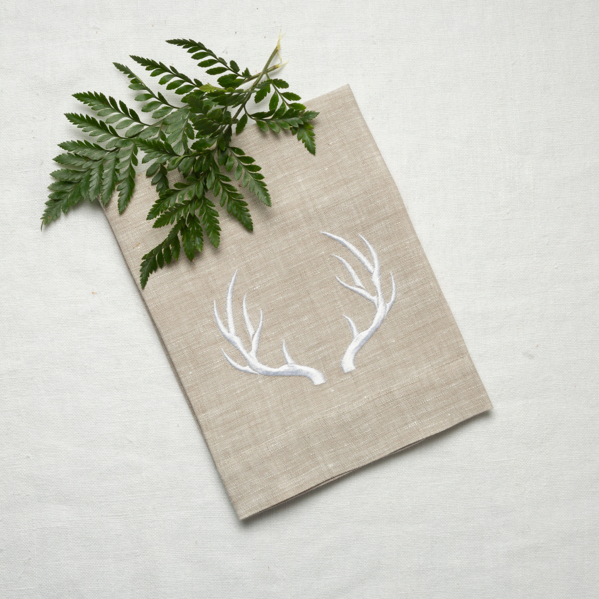 Ces serviettes 100% lin européen sont un mélange parfait d'élégance et de beauté. À combiner avec un chemin de table, un carré de table ou des sets de table pour parfaire le look. Chaque serviette est brodée d'un motif Antler.