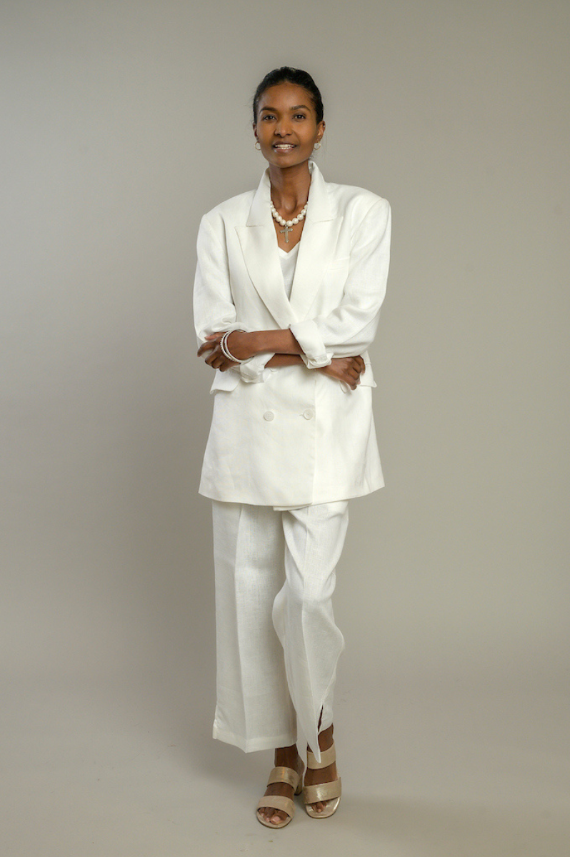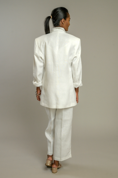 Ce blazer féminin et intemporel est composé à 100% de lin européen. Les boutons à double boutonnage et la structure épurée créent un look sophistiqué qui se marie bien avec les basiques décontractés et vos robes préférées.