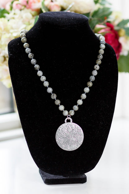 Présentation du collier Marinella - un accessoire exquis pour ajouter une touche d'élégance et de classe à n'importe quelle tenue. Raffiné et élégant, il présente de belles pierres de labradorite et un charme en étain qui a un éclat captivant. Parez-vous de ce collier magnifiquement conçu et soyez prêt à éblouir !