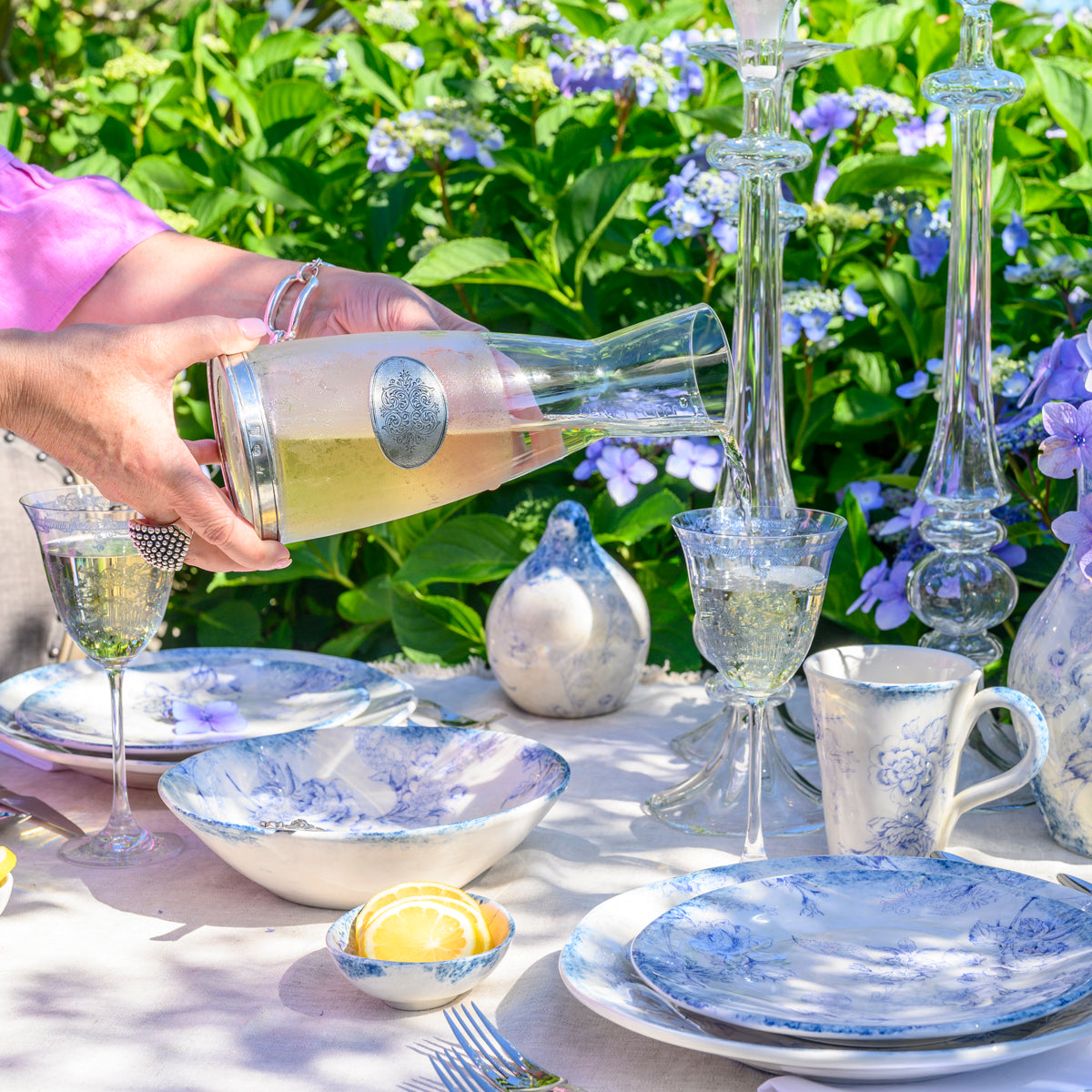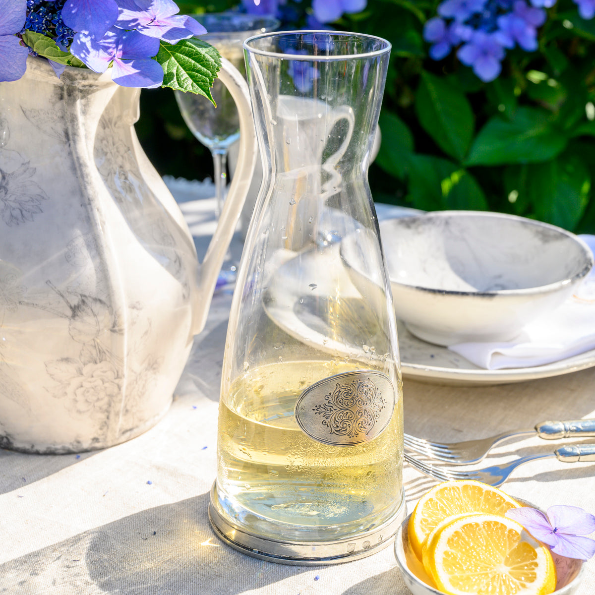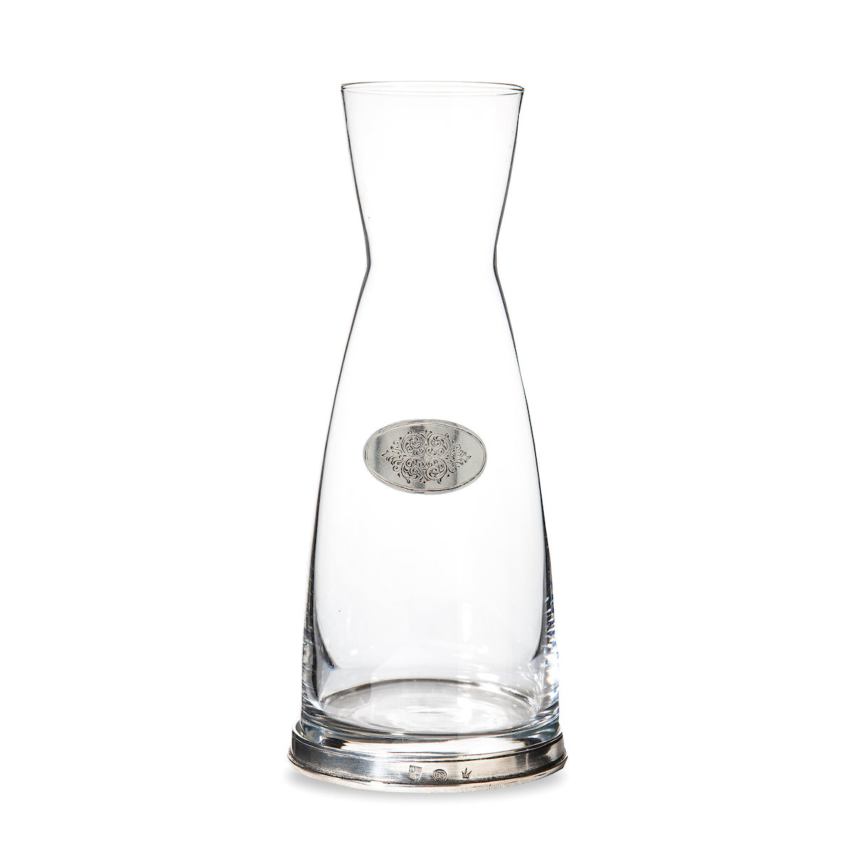 Cette nouvelle carafe sophistiquée est dotée d'un sceau damassé gravé à la main en étain et d'une base garnie d'étain. Assurez-vous de vérifier la carafe de chevet Taverna pour voir la version plus petite de cet article.