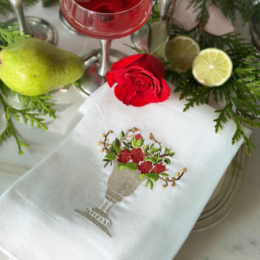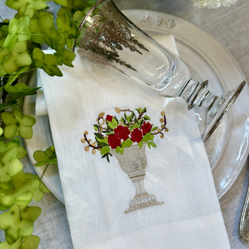 Add a touch of timeless Italian elegance to your kitchen or bath with this beautiful 100% European linen towel. Embroidered with a classic urn brimming with red roses and lush greenery. So many ways to add beauty to any part of your home. Machine wash and iron flat for a crisp look. Tab on back for hanging.