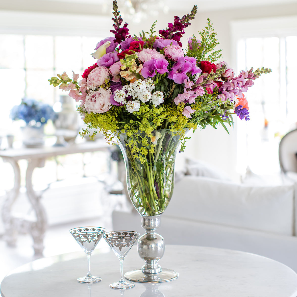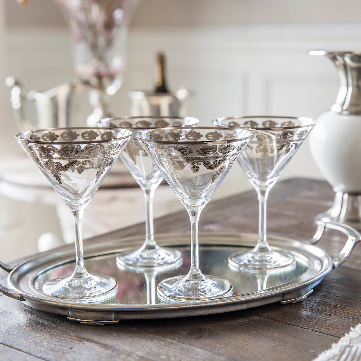 Les artisans en dehors de Florence combinent magnifiquement des matériaux luxueux, des détails complexes et des touches subtiles. Cette pièce est gravée à la main et peinte avec des reflets de platine. Verre italien, fabriqué à la main en Italie.