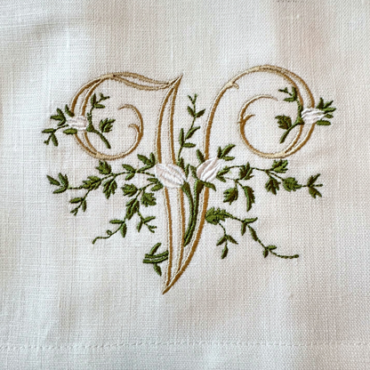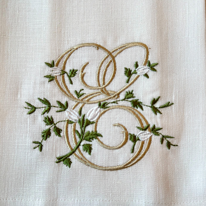 Add a personal touch to your kitchen or bath with a beautiful Floral Monogram towel. Our 100% linen tea towel is a perfect mix of elegance and beauty. Each towel is embroidered with a script initial adorned with delicate white flowers. 21 different letters available.