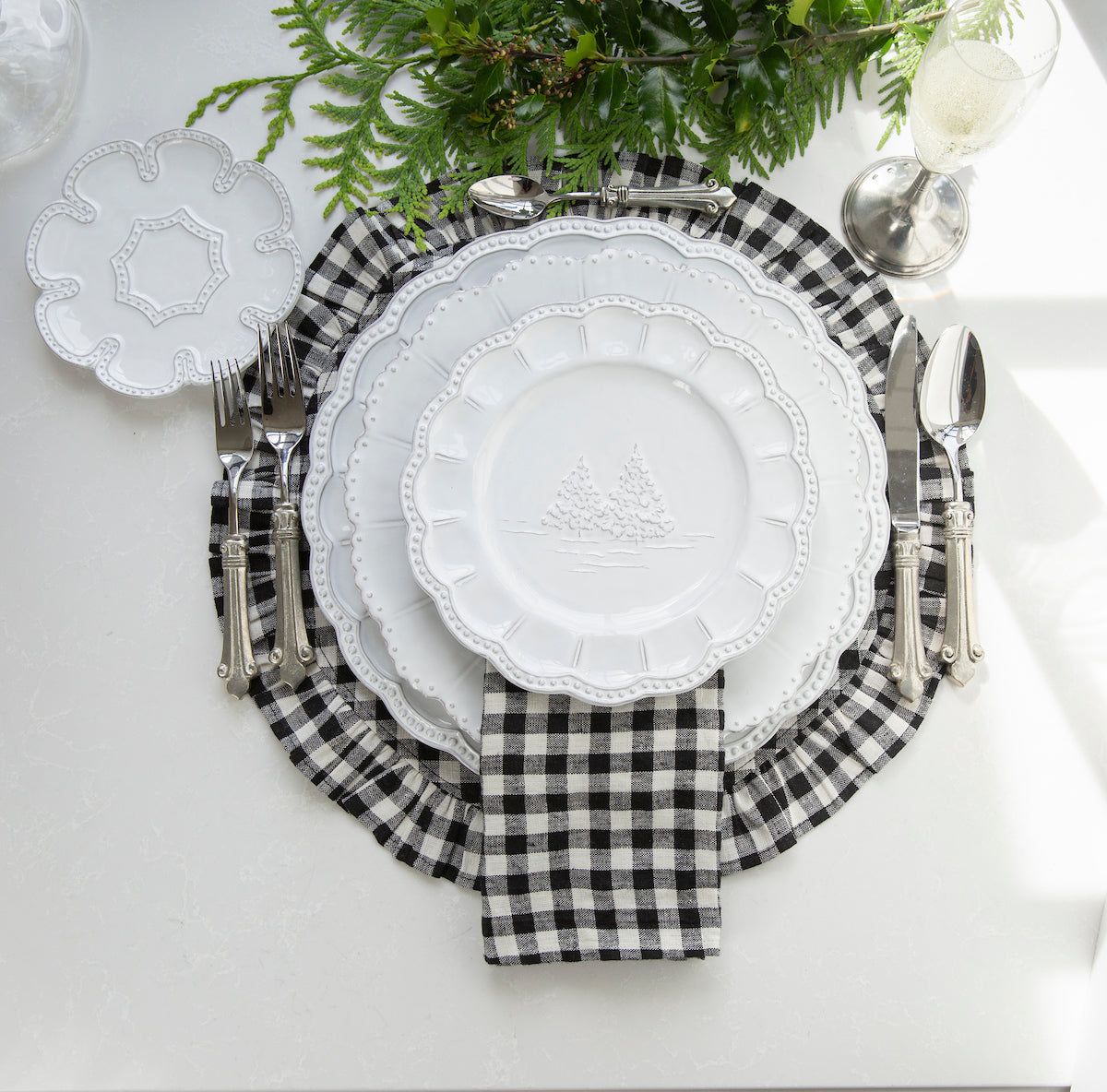 Stopping by the Woods on a Snowy Evening... Add a touch of holiday magic to your table with our Bella Natale Salad / Dessert plate, made of coveted Italian stoneware and featuring beautiful evergreen trees in the snowy Italian countryside. Perfect for your favorite appetizers, snacks and desserts, the soft winter white pairs beautifully with our popular Bella Bianca Collection.