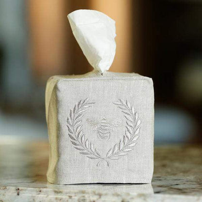Enjoy this 100% European linen embroidered tissue box cover. It is a perfect way to dress up any room and hide the unsightly tissue box. Fits a standard size tissue box.