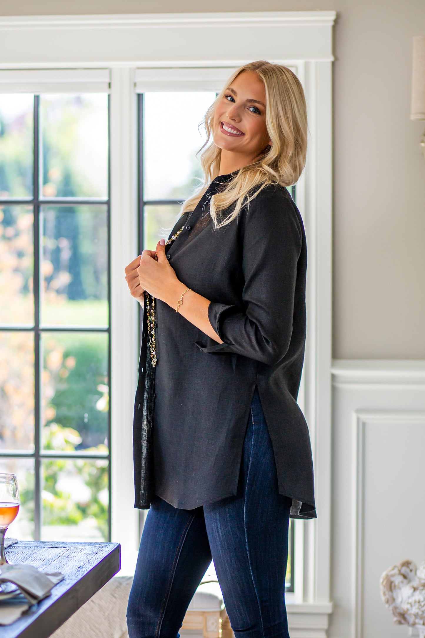 Another one of our best sellers! The Christina linen button up tunic with slits on the side and a bit longer in length so it can be worn over leggings, skinny jeans, or as a light jacket. Very comfortable for a casual look or dress it up.