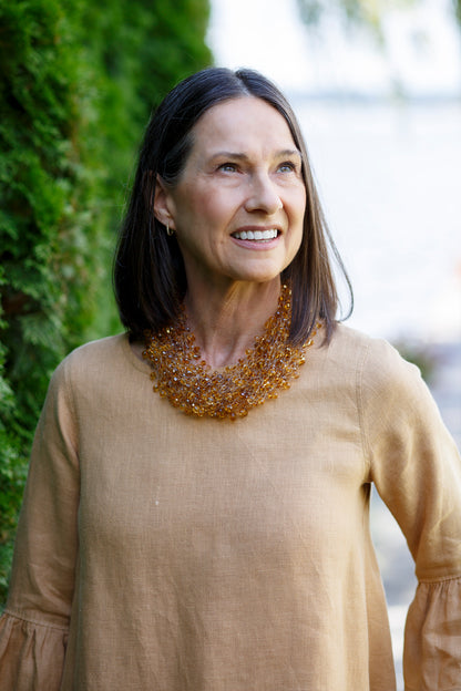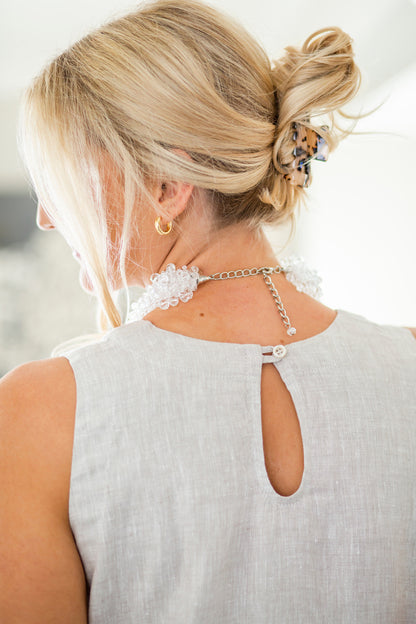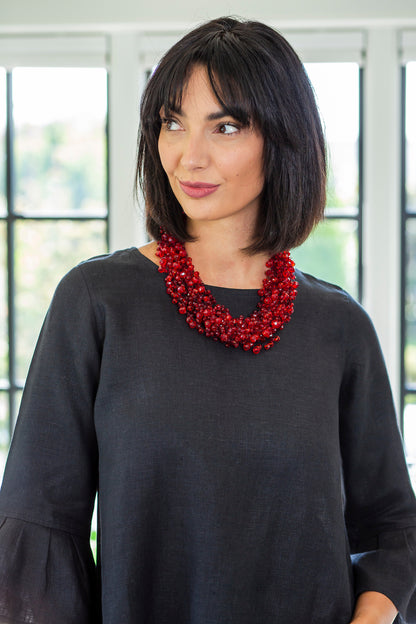 Make a statement in our Crystal Bead Cluster Necklace! This necklace, made of many strands of crystal beads strung together is the perfect complement to our beautiful linen clothing. The necklace is lightweight and feels wonderful around your neck.