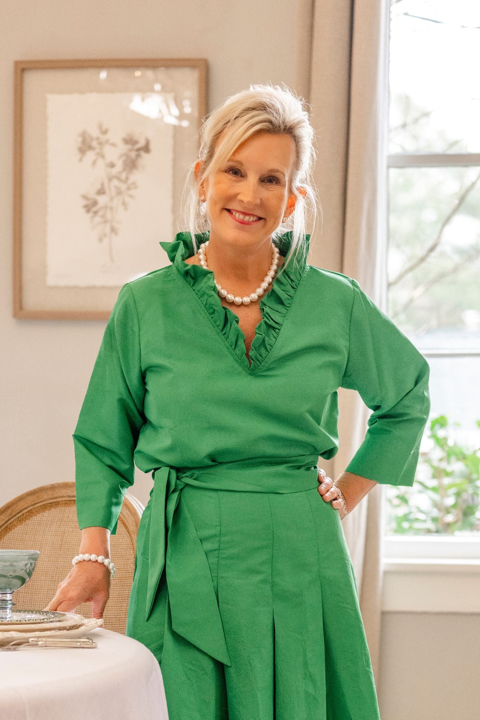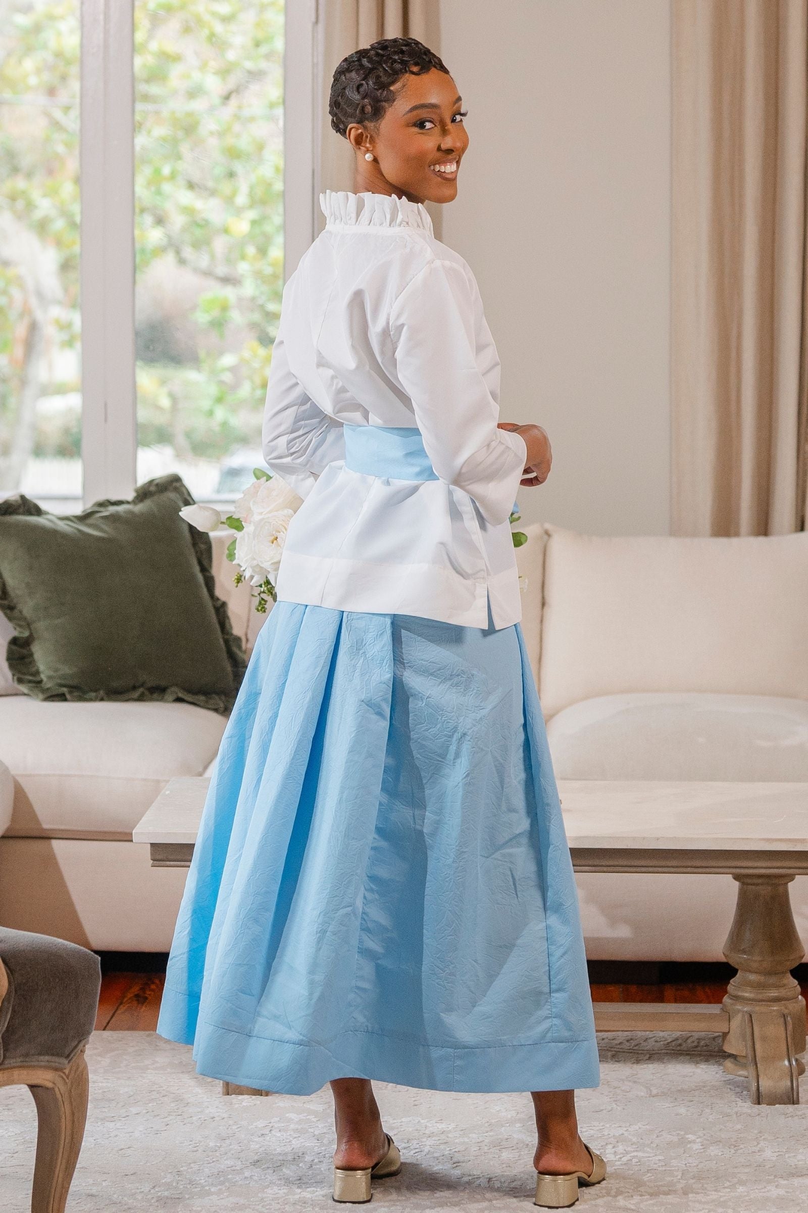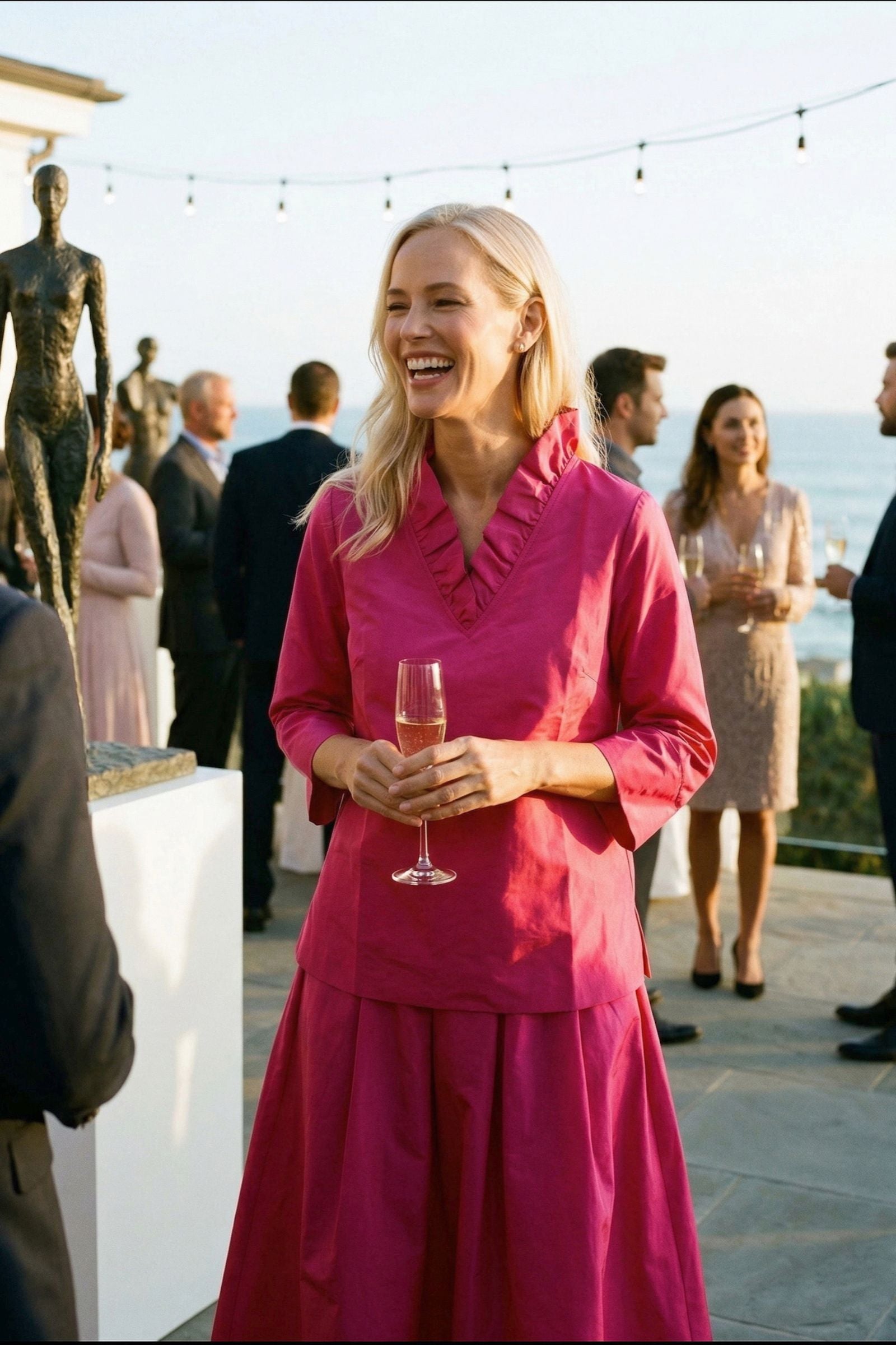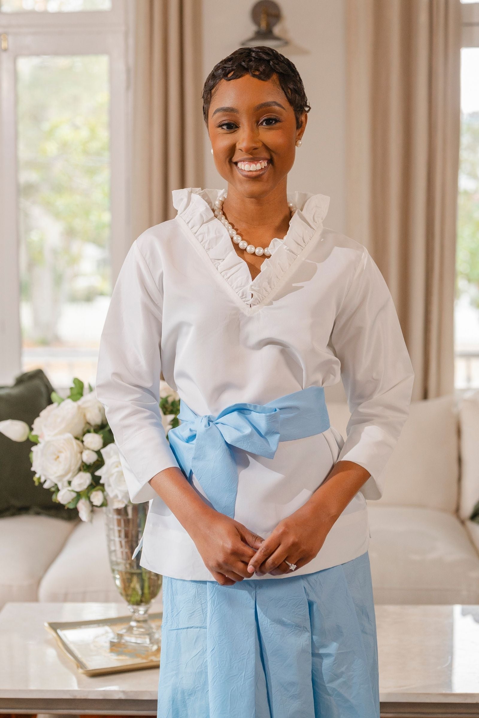 The Darcy Top is inspired by the Francesca Dress - a shirt version of this playful dress! With the elegant ruffle V-neck collar, this top taffeta is both stylish and practical. Perfect for any occasion, from brunch to a night out with the girls. Sure to become a staple in your wardrobe.