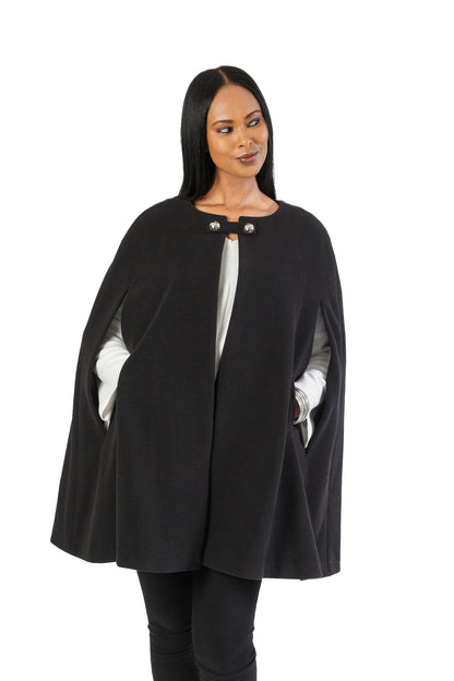 Wrap yourself in exquisite warmth and timeless style with our sophisticated Dylan Cape. Crafted from a luxurious wool, cashmere and viscose blend in classic Black and elegant Ivory, it's sure to lend modern glamour to any look. Fully lined with pockets and a button notch collar closure, it is perfect to wear over a dress or with jeans!  The Dylan Cape is sure to become your go-to throughout the Fall and Winter seasons.