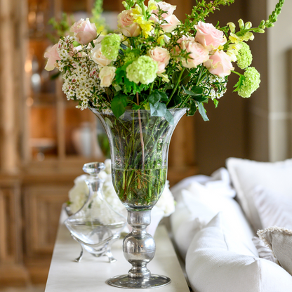 As a vase or hurricane, mouth-blown glass and a stately pewter base make this piece an heirloom. Italian pewter and glass, Hand made in the Lombardy Region of Italy.