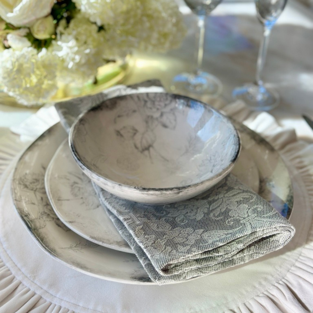 Our Giulietta Collection, light, beautiful and romantic is the result of truly extraordinary artistry. The design is applied to the ceramic by hand, fired and then hand painted with a sponge before being fired a second time. Little wonder it is so fair! Offered in both blue and gray. Hand made in Tuscany.