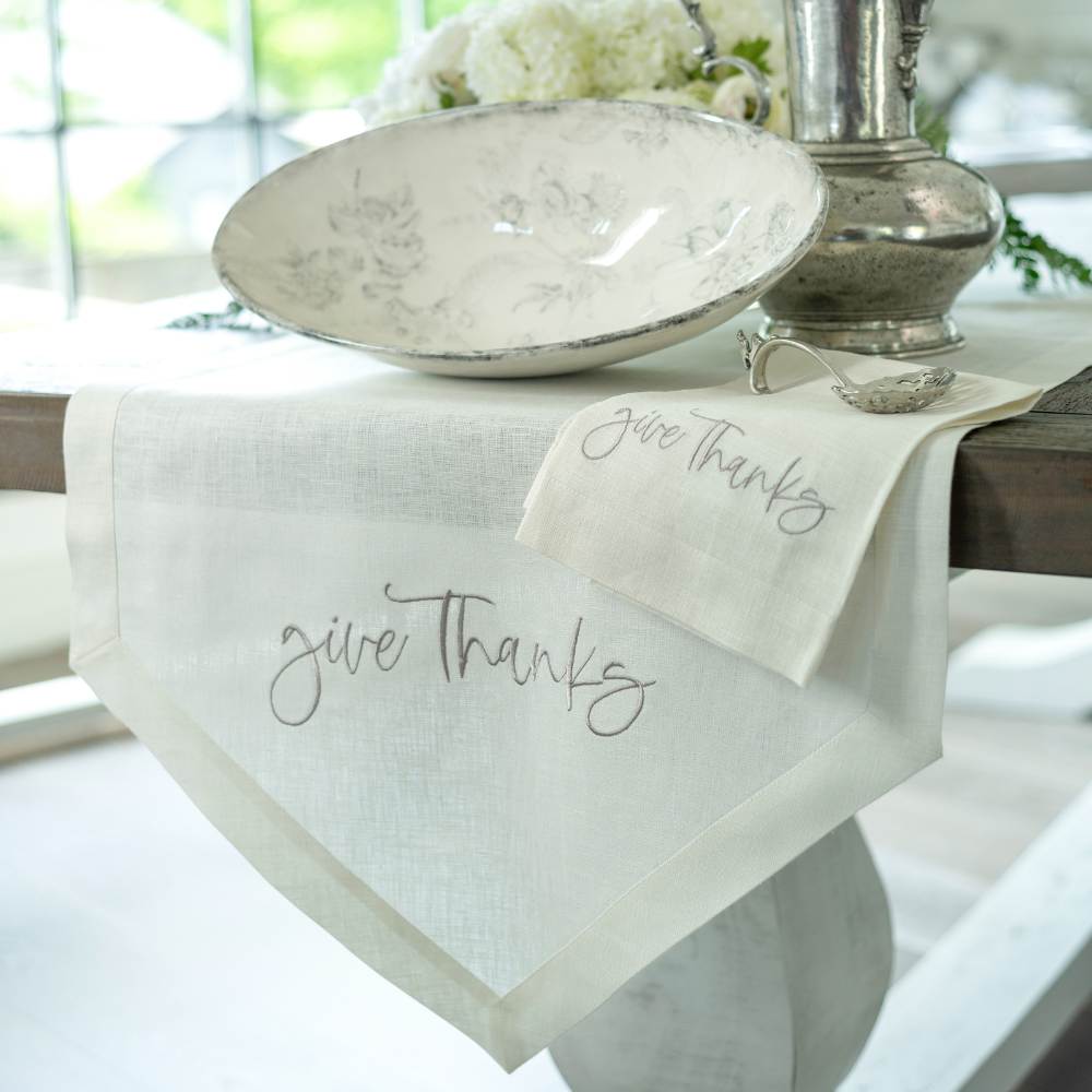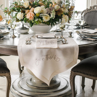 Create an elegant focal point for your autumn table with our Give Thanks table runner, designed at a graceful 22" width to frame your dining experience. Pair with coordinating napkins for a polished tablescape that celebrates the season with understated sophistication.