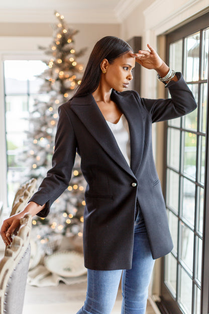 This refined long blazer combines luxurious wool and cashmere for an understated sophistication that transitions seamlessly from day to evening. Its versatile silhouette works beautifully layered over dresses or paired with tailored trousers or jeans, while thoughtful sleeve slits add subtle dimension. Complete with full lining for a polished finish, the Joey delivers the kind of enduring style that elevates any wardrobe.