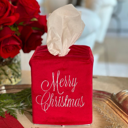 Enjoy this velvet embroidered tissue box cover with our Merry Christmas embroidery. It is a perfect way to dress up any room, complete that elegant seasonal look, and hide the unsightly tissue box.