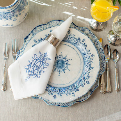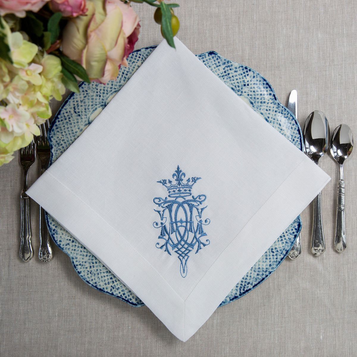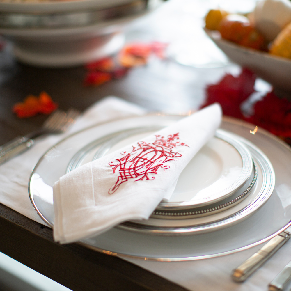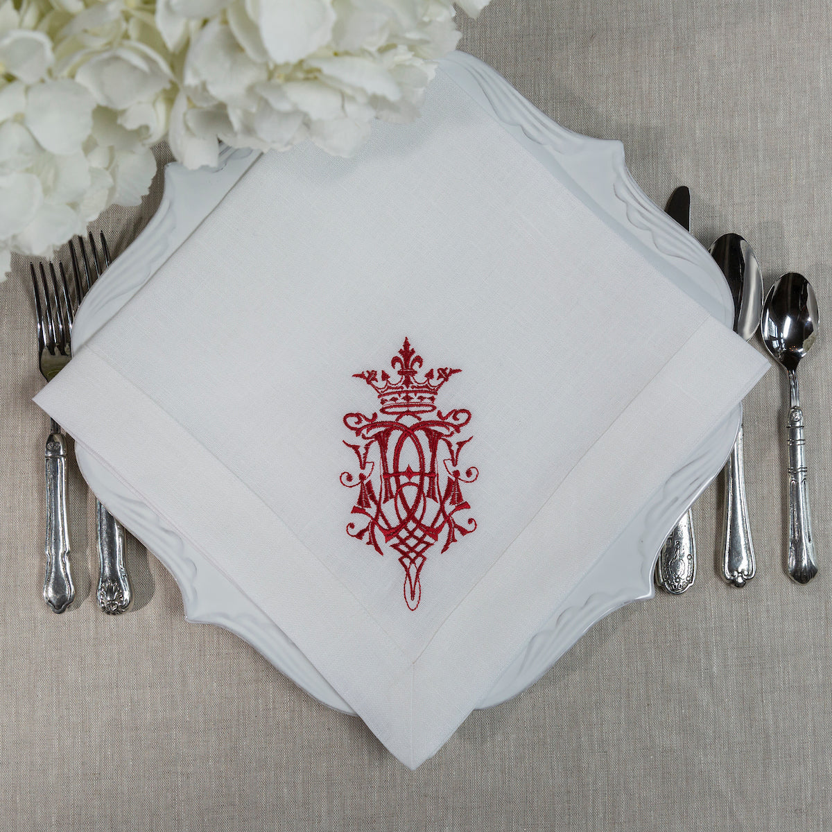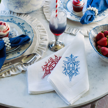 Our 100% European linen napkins are a perfect mix of elegance and beauty. Combine with a runner, table square or placemats to finish off the look. Each napkin is embroidered with our "Royal" design on one side corner. Machine wash and lay flat to dry for a soft and comfortable look. Iron if desired for a more formal appeal.