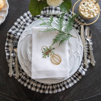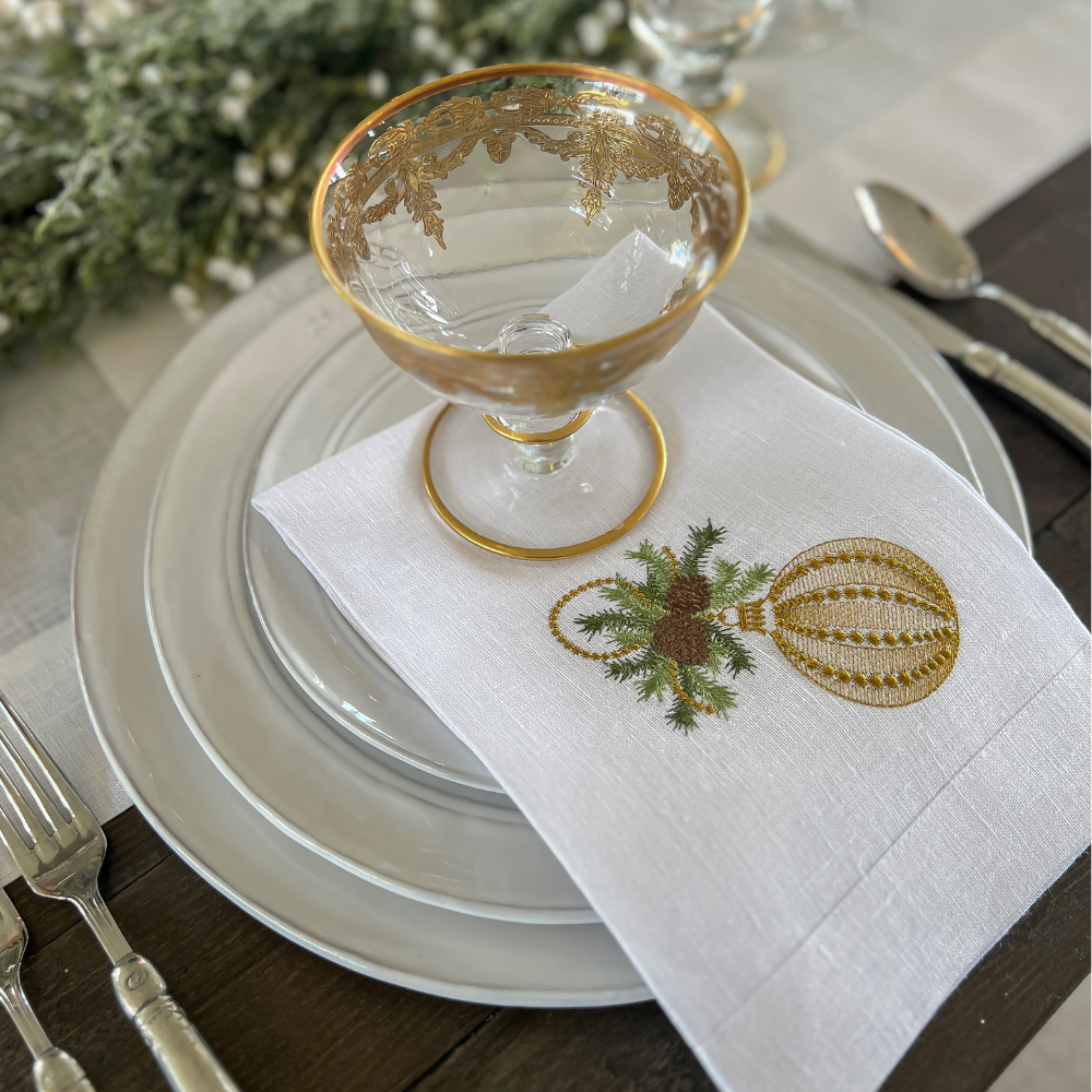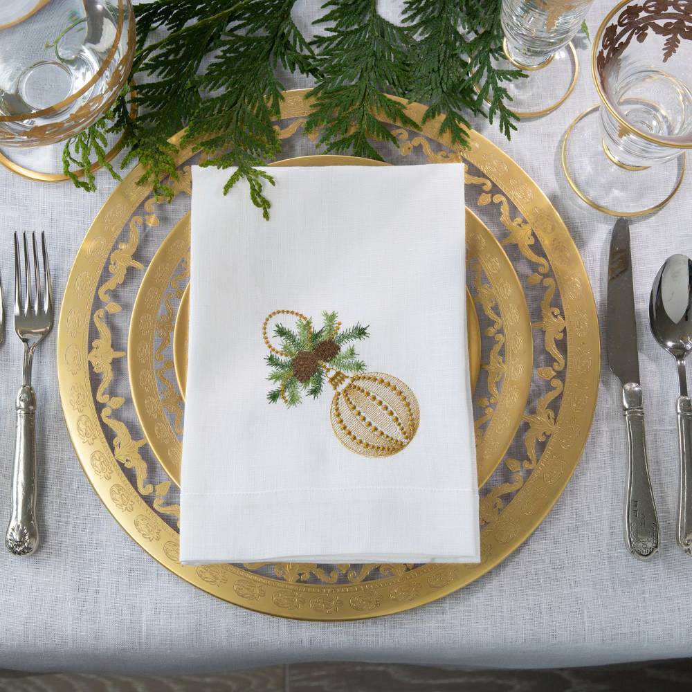 100% European linen napkins are a perfect mix of elegance and beauty. Combine with a runner, table square or placemats to finish the look. Each towel is embroidered with a "Christmas Ornament" design.