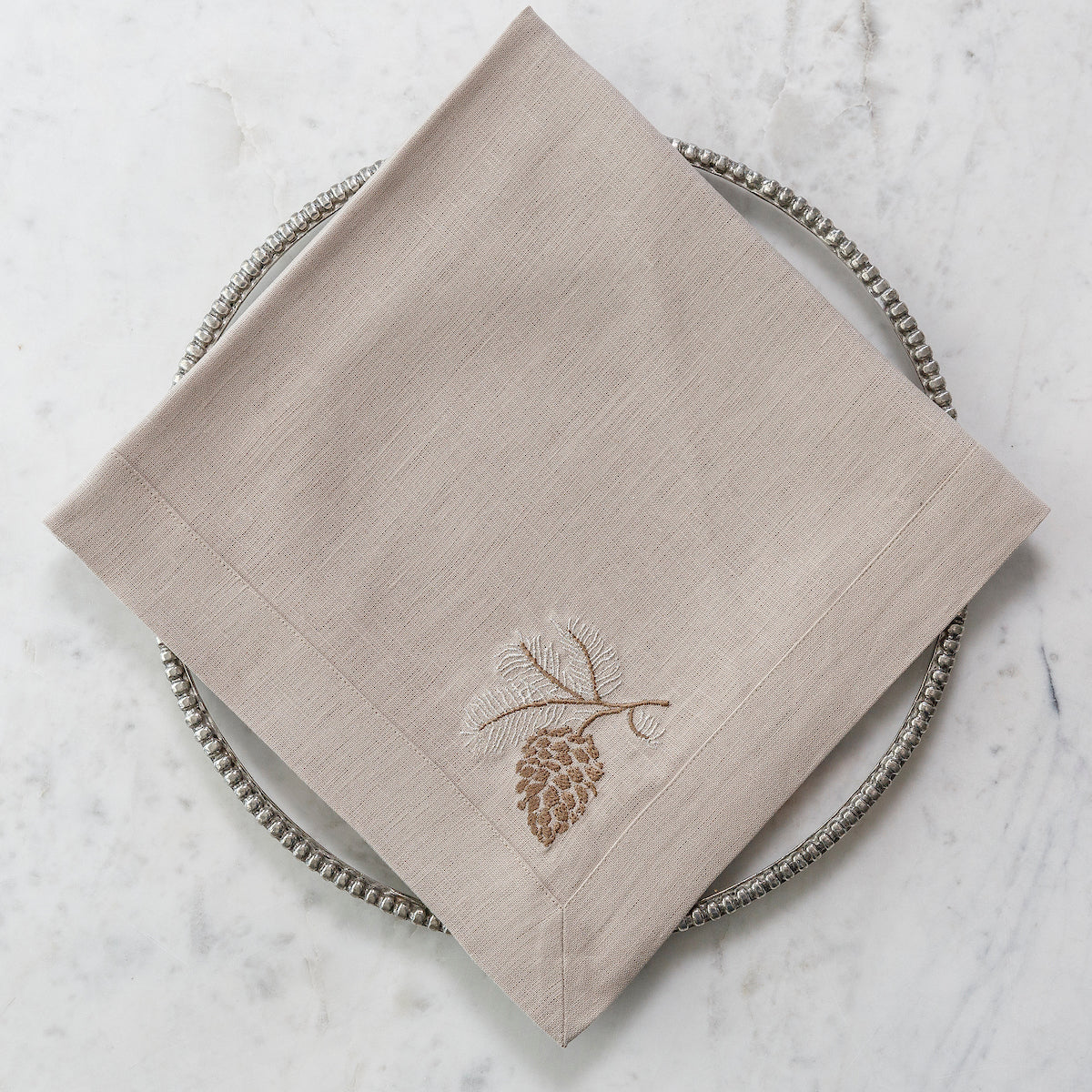 Bring nature indoors with this gorgeous embroidered pinecone napkin. Perfect for any time of year. Machine wash and lay flat to dry. Iron if desired. To soften and give a more casual look throw in the dryer on Air dry and tumble for a few minutes with no heat.