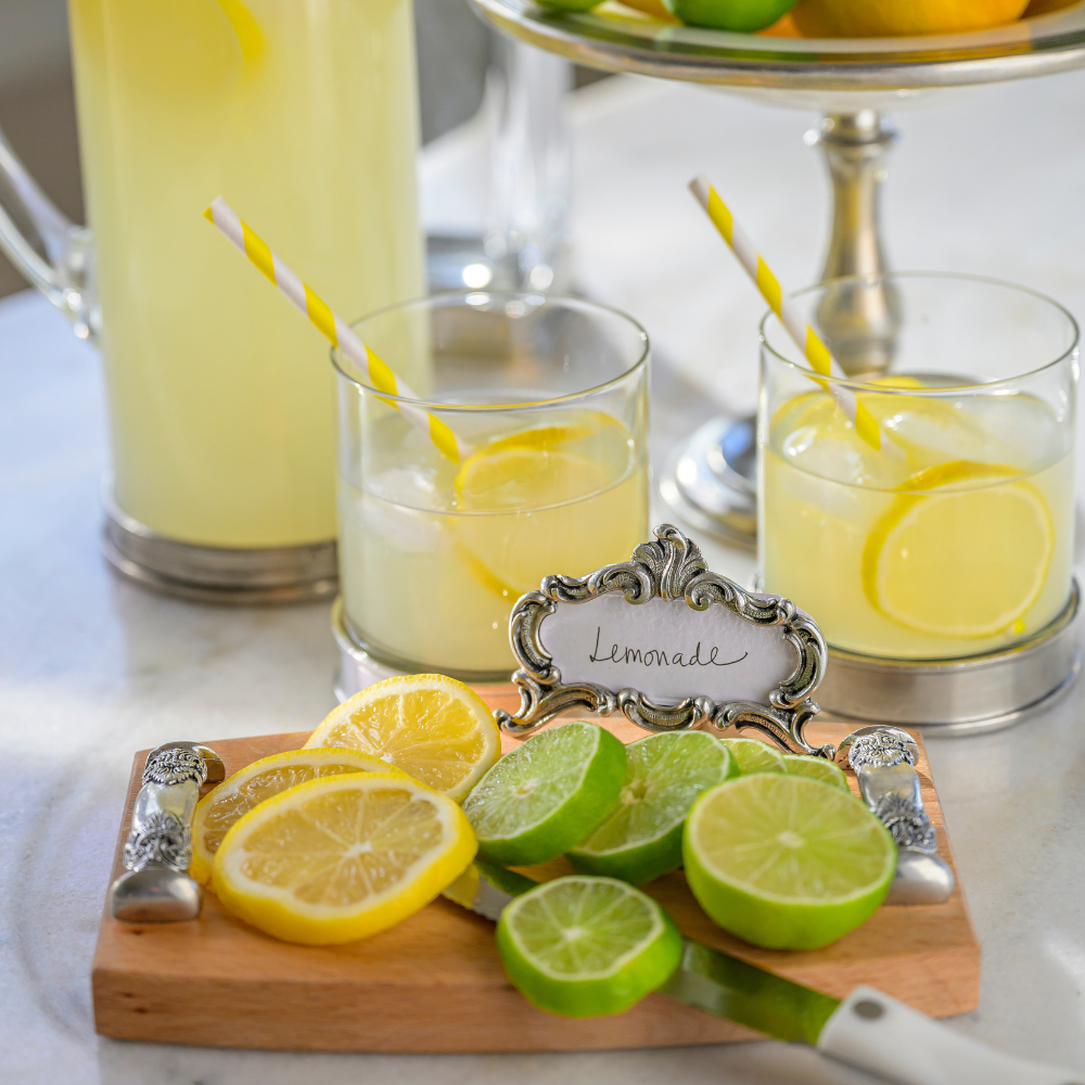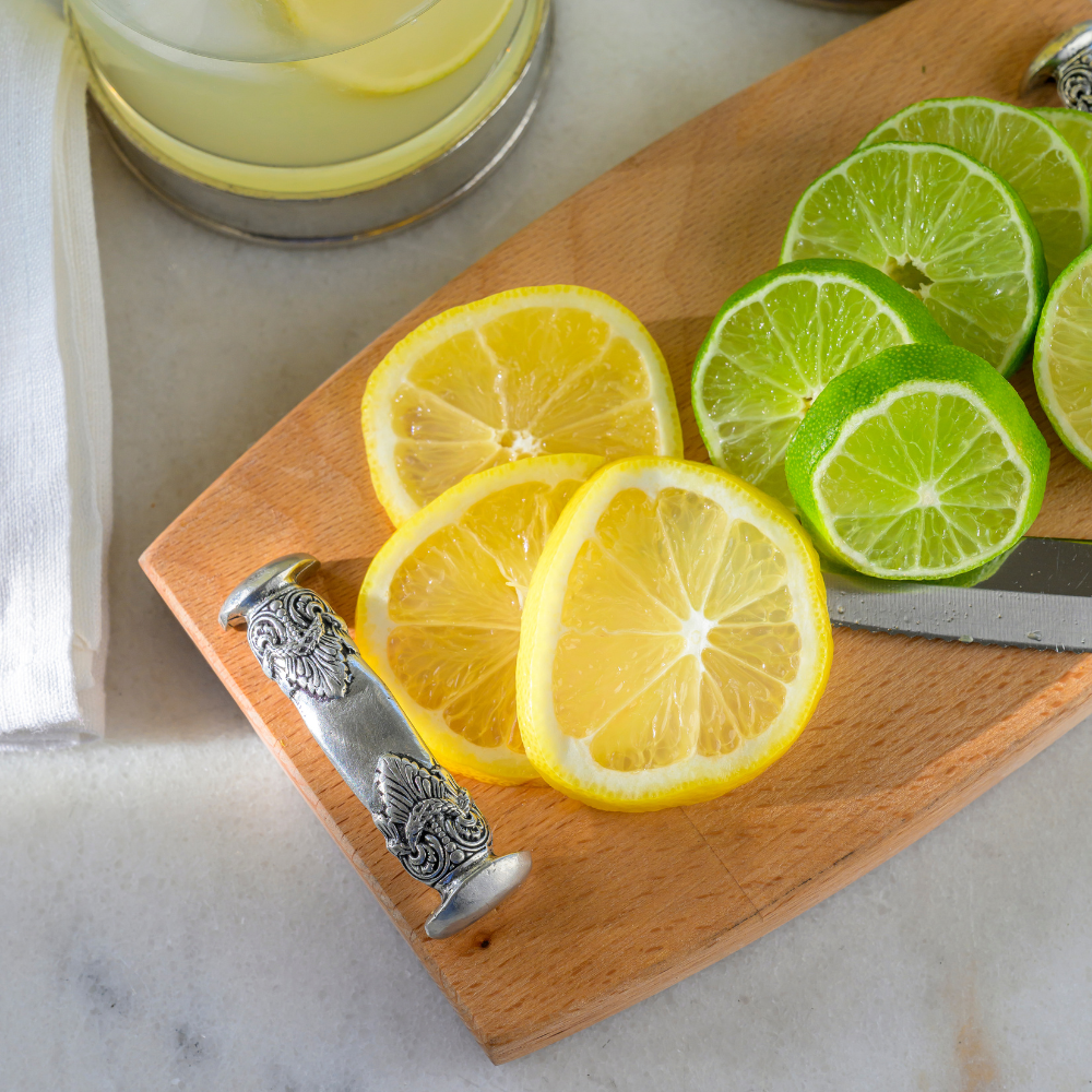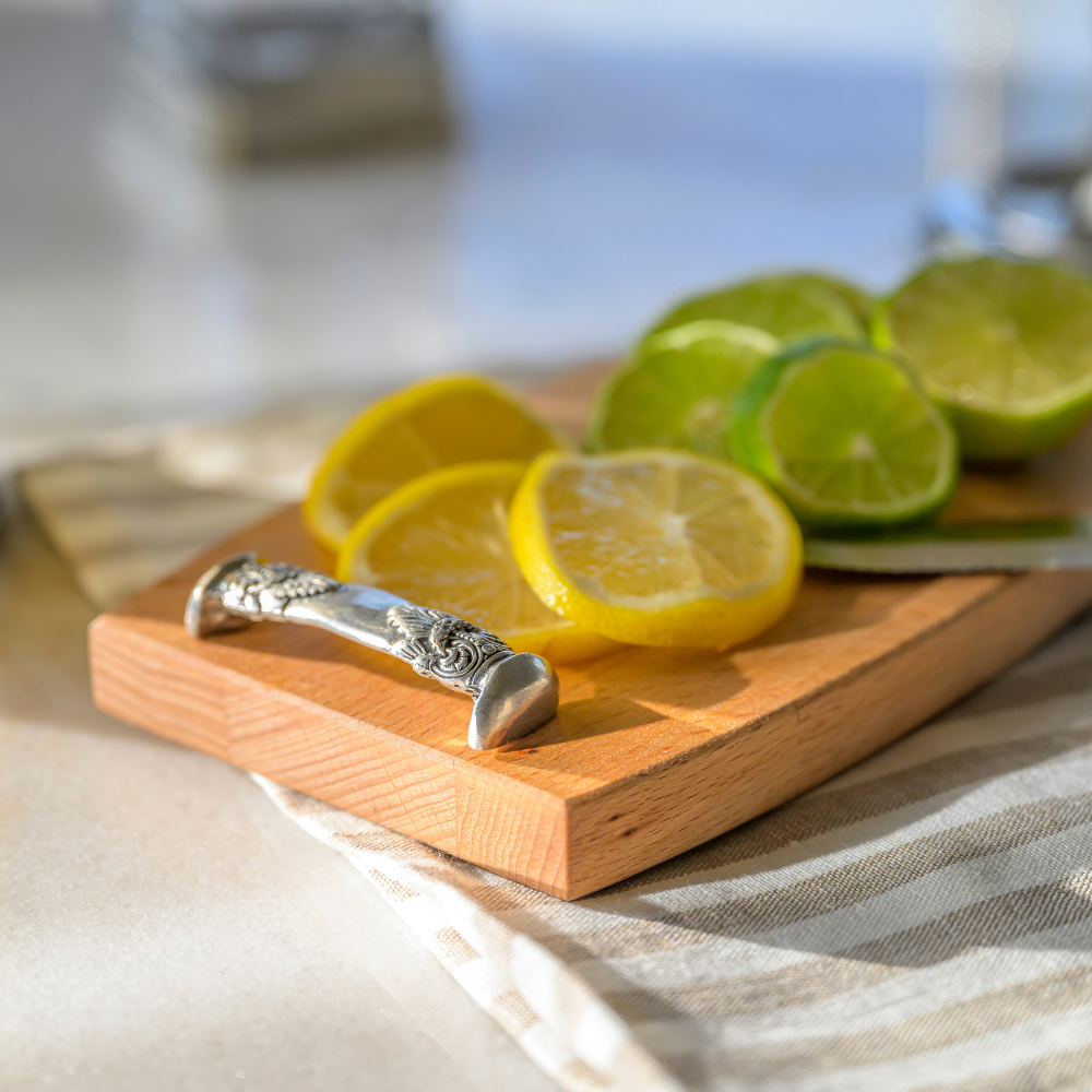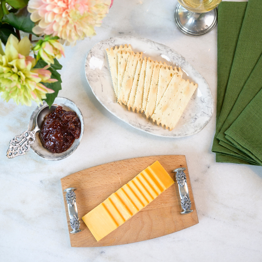A few friends are stopping by and you want to offer them a little something. Our Regale Wood Bar Board is just the piece you need! The beautiful beachwood surface with stamped pewter handles is both stylish and casual. Perfect, beautiful serving piece for cutting limes and lemons at your bar or presenting a selection of cheese. Another wonderful everyday piece!