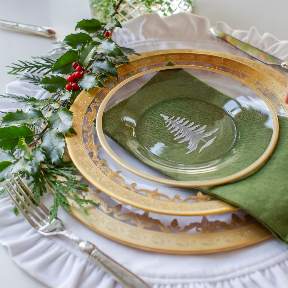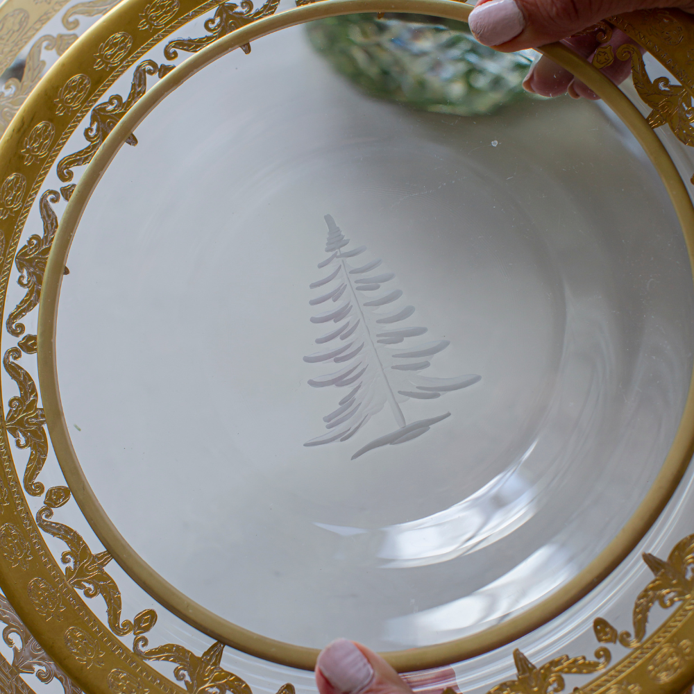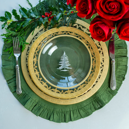 This stunning holiday salad plate brings Winter beauty to any table setting, especially our Vetro Gold table settings. This plate features an etched fir tree with a Gold border.