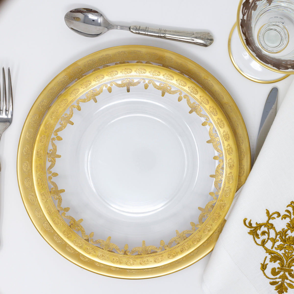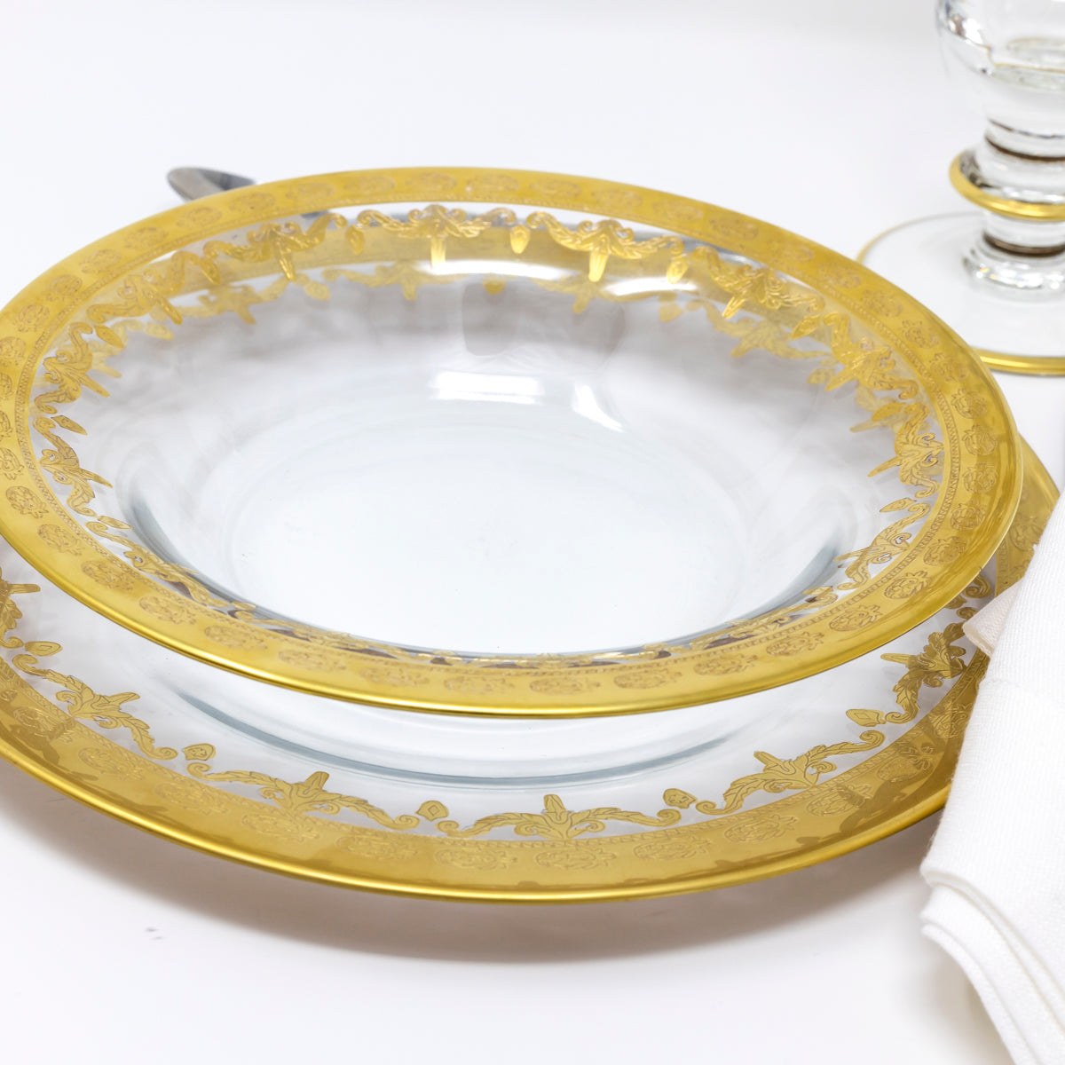 Our Vetro Gold Collection has been known to leave guests speechless. Florentine master artisans hand paint 24-karat gold highlights on intricate hand etched designs. The results are nothing short of extraordinary. One of our most popular collections. Hand made in Tuscany.